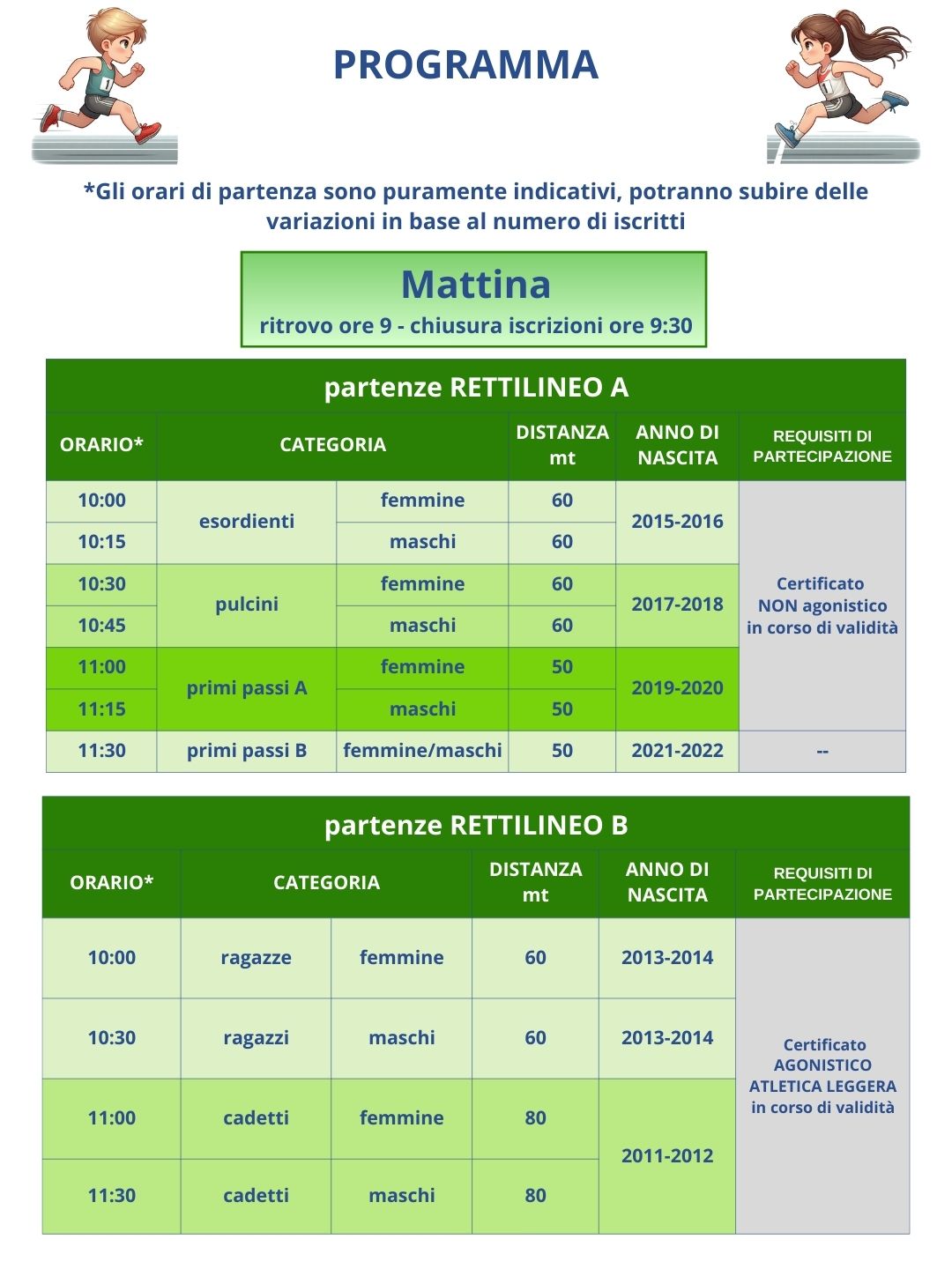 Il ritrovo è fissato alle ore 9 per le gare giovanili della mattina, alle ore 13 per quelle del pomeriggio e alle ore 15 per la corsa competitiva e la ludico-motoria presso l’Impianto Bruno Betti. La partenza della corsa e della camminata è prevista alle ore 16. Le gare giovanili si svolgeranno in pista dalle 10 alle 11.30 e dalle 14 alle 15.20, secondo le categorie.