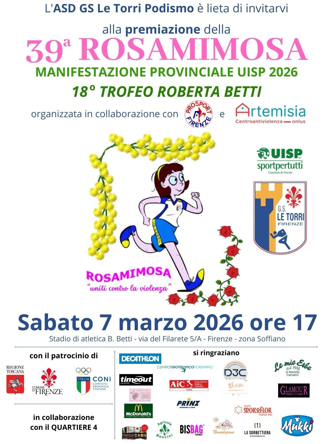 Sabato 7 marzo 2026, all’Impianto Sportivo Bruno Betti (Via del Filarete 5, Firenze), torna la 39ª Rosamimosa – 18° Trofeo Roberta Betti, storica manifestazione sportiva organizzata da A.S.D. GS Le Torri Podismo, dedicata al messaggio “Uniti contro la violenza”.