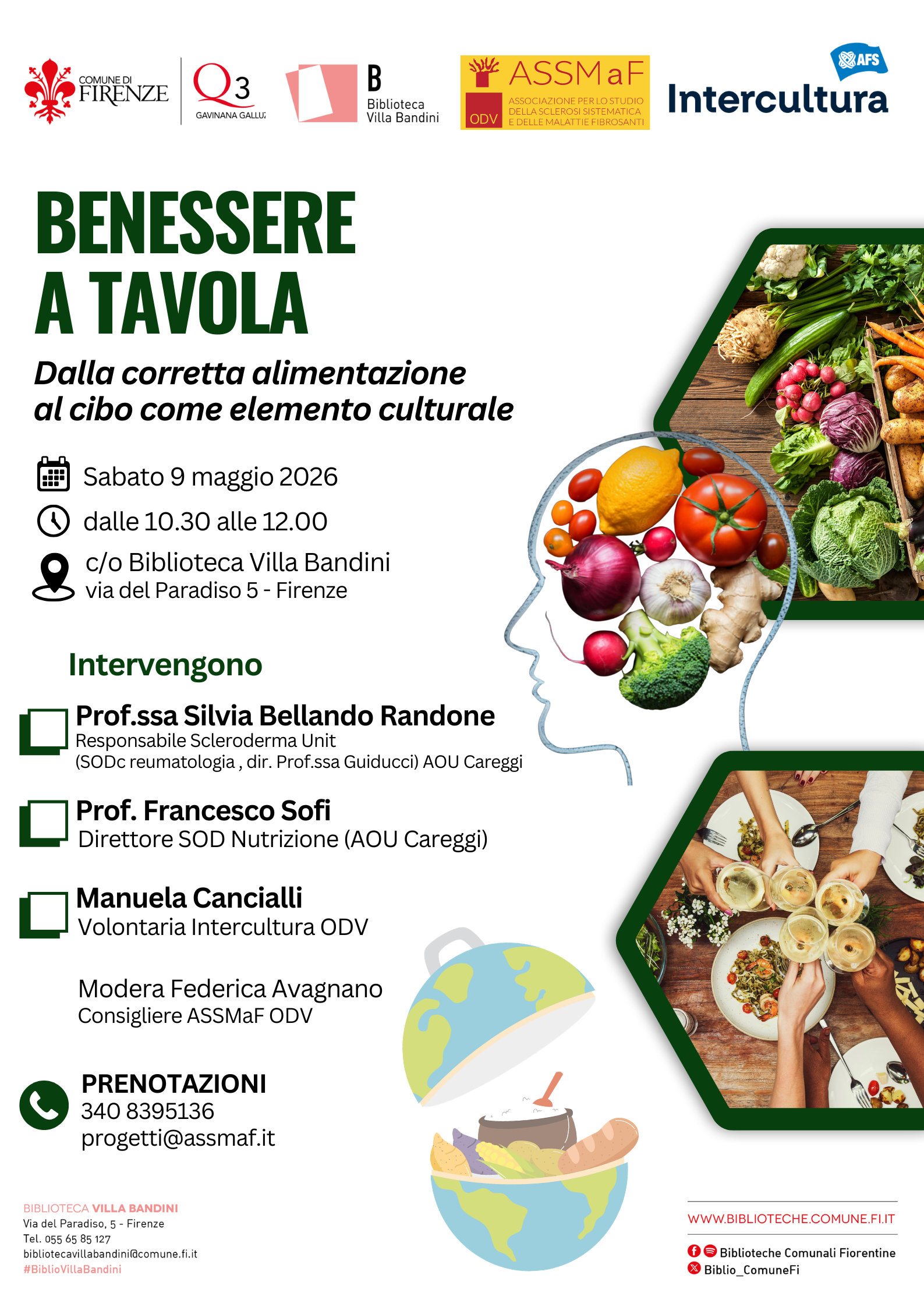 Sabato 9 maggio 2026 dalle ore 10.30 alle ore 12.00 si terrà presso la biblioteca Villa Bandini (via del Paradiso, 5 - Firenze) un incontro seminariale gratuito e aperto alla cittadinanza nel quale si parlerà di benessere a tavola con due focus principali: uno di tipo medico, sulla corretta alimentazione, grazie alla relazione del Prof. Francesco Sofi, Direttore SOD Nutrizione, AOU Careggi, e alla Prof.ssa Silvia Bellando Randone, Reparto reumatologia AOU Careggi, e uno di tipo culturale, con un intervento da parte di professionisti/ volontari di Intercultura ODV, curati da Laura Ceccherini, referente di zona per lo sviluppo del volontariato (Toscana, La Spezia, Perugia, Foligno). Modererà l’incontro Federica Avagnano, progettista e parte del Consiglio Direttivo di ASSMaF ODV.