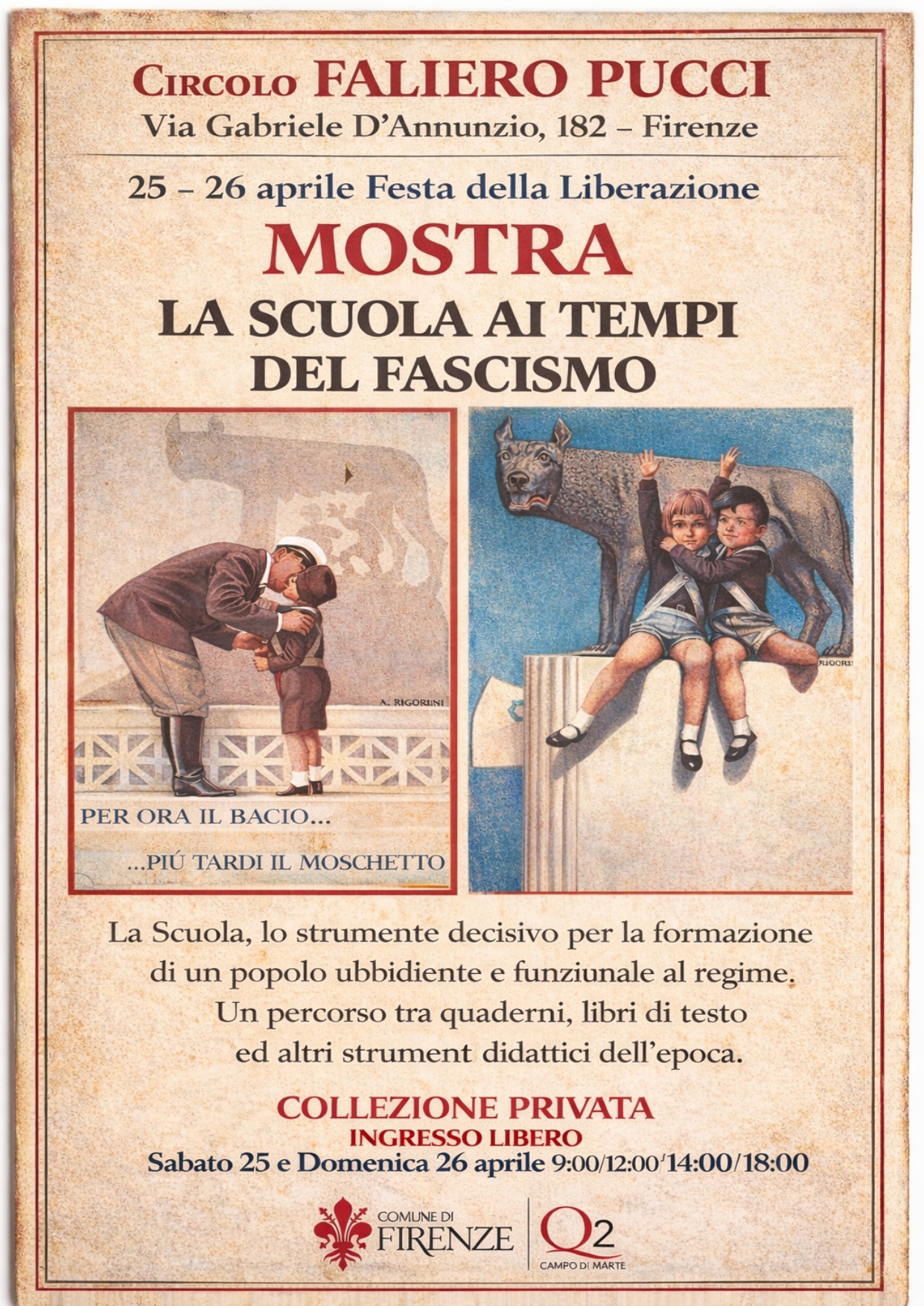 Nuova mostra in esposizione, in occasione della Festa della Liberazione, presso il Circolo Faliero Pucci in Via Gabriele D'Annunzio 182, dal titolo "La scuola ai tempi del fascismo", a cura di Duccio Gori con la collaborazione del Quartiere 2; un percorso tra quaderni, libri di testo e altri strumenti didattici dell'epoca, alla scoperta di uno strumento decisivo per la formazione di un popolo ubbidiente e funzionale al regime.