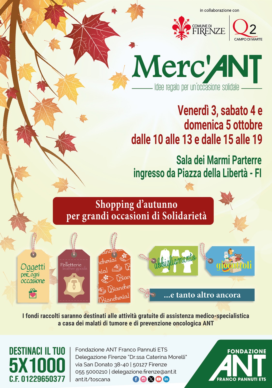 Torna con l'edizione autunnale del 2025 il Merc'ANT, il mercatino solidale proposto da Fondazione ANT Onlus con il patrocinio del Comune di Firenze i cui proventi andranno interamente a sostenere le attività di assistenza domiciliare e specialistica che ANT offre gratuitamente ai malati di tumore e alle loro famiglie in 10 regioni italiane tra cui la Toscana (dove opera a Firenze, Prato, Pistoia) e i progetti di prevenzione oncologica sempre gratuiti portati avanti dalla Fondazione.