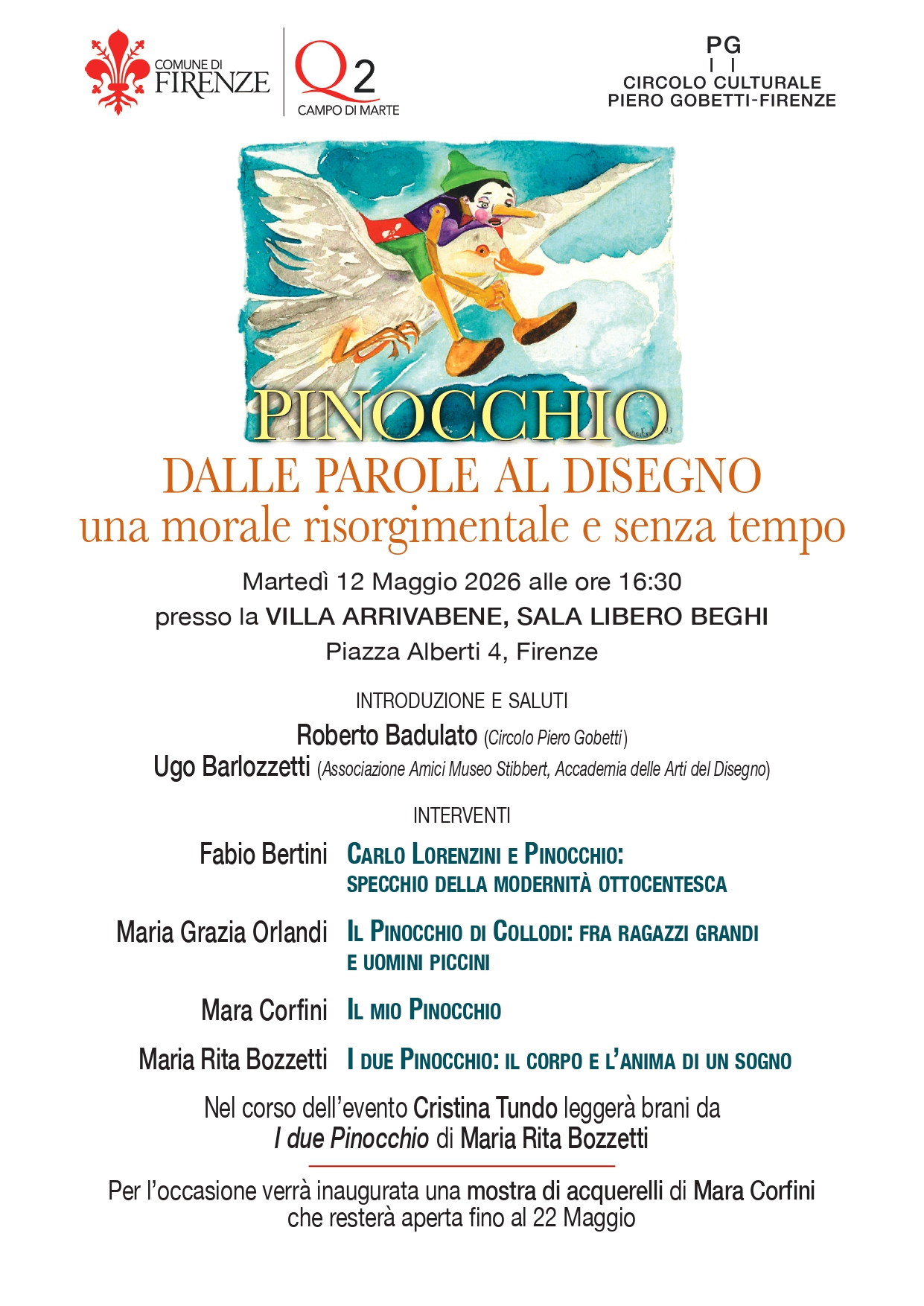 Martedì 12 Maggio alle ore 16.30, nella Sala Libero Beghi in Villa Arrivabene, in occasione del bicentenario della nascita di Carlo Collodi, si terrà la conferenza dal titolo "Pinocchio: Dalle parole al disegno - Una morale risorgimentale e senza tempo", a cura di Roberto Badulato con la partecipazione e i saluti di Ugo Barlozzetti e gli interventi di Fabio Bertini, Maria Grazia Orlandi, Mara Corfini e Maria Rita Bozzetti; per l'occasione verrà inoltre inaugurata una mostra di acquerelli che resterà in esposizione fino al 22 Maggio.
