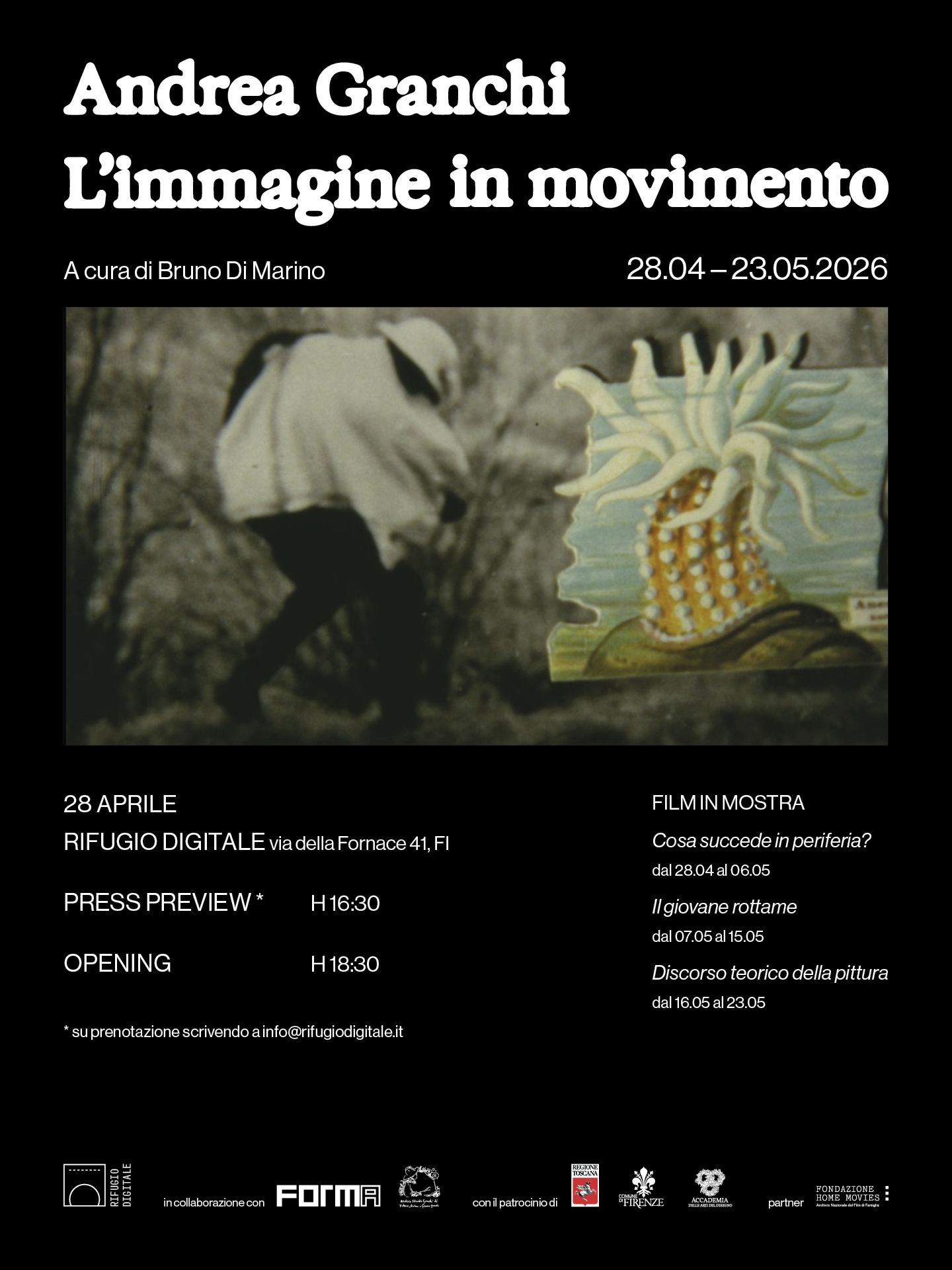 L’opening si terrà martedì 28 aprile alle ore 18.30 presso la galleria Rifugio Digitale, in via della Fornace n.41, Firenze, preceduto da un talk alle ore 17.00 sempre in galleria. La mostra, a cura di Bruno Di Marino, è una retrospettiva dedicata all’artista e filmmaker fiorentino Andrea Granchi, tra i pionieri del cinema d’artista italiano