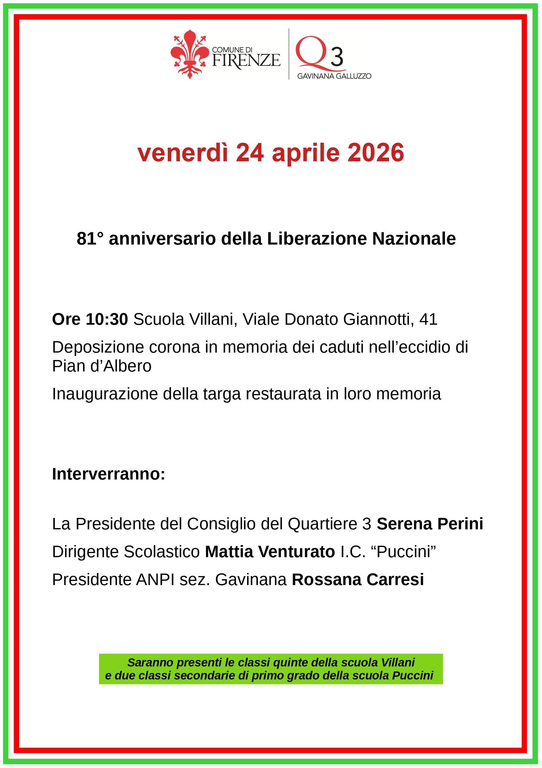 Il 24 aprile 2026 alle ore 10.30 presso la Scuola Villani in Viale Donato Giannotti, 41 sarà deposta una corona in memoria dei caduti nell’eccidio di Pian d’Albero e verrà inaugurata la targa restaurata in loro memoria.