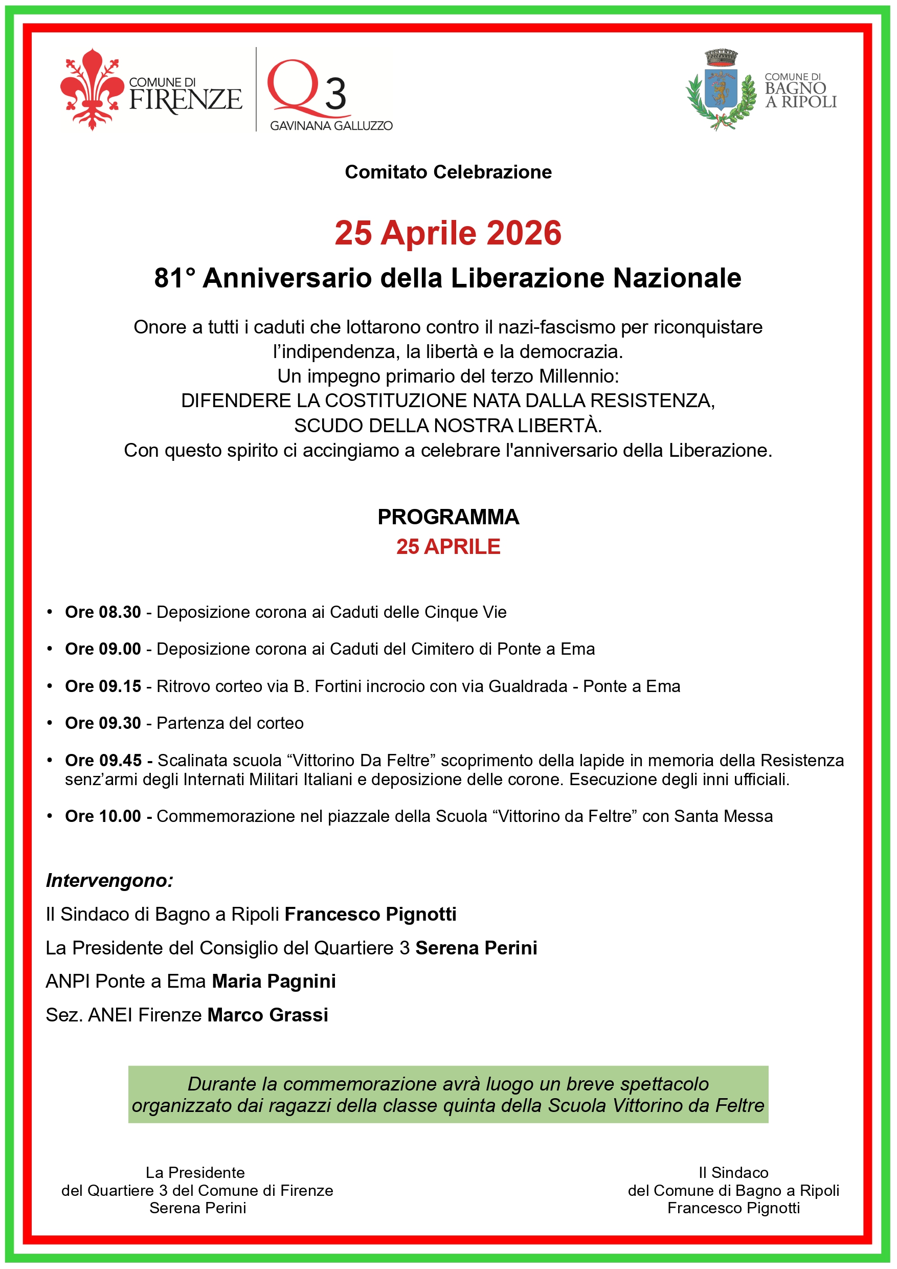 ● Ore 09.45 - Scalinata scuola “Vittorino Da Feltre” scoprimento della lapide in memoria della Resistenza senz’armi degli Internati Militari Italiani e deposizione delle corone. Esecuzione degli inni ufficiali.