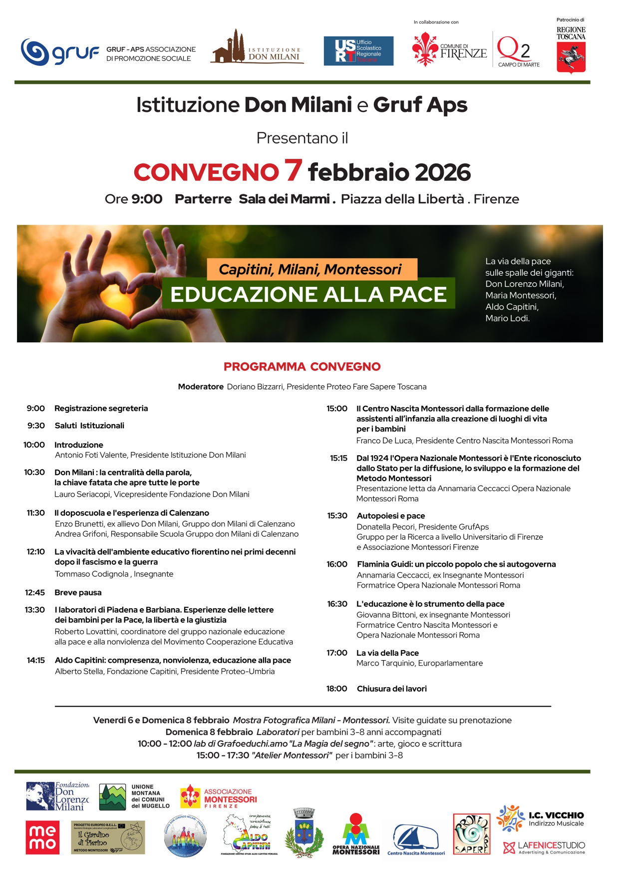 “Capitini, Milani, Montessori. Educazione alla pace” è il titolo del convegno che si terrà il 7 febbraio al Parterre di Firenze, con inizio alle ore 9. Lo organizzano l’Istituzione culturale Don Milani e il GRUF Gruppo Ricerca a livello Universitario di Firenze APS in collaborazione con l’Ufficio Scolastico Regionale e il Quartiere 2 del Comune di Firenze e con il patrocinio della Regione Toscana, del Comune di Vicchio e dell’Unione Montana dei Comuni del Mugello. Tra i soggetti coinvolti Fondazione Capitini, Fondazione Don Milani, Gruppo Don Milani di Calenzano, Opera Nazionale Montessori e Centro Nascita Montessori.