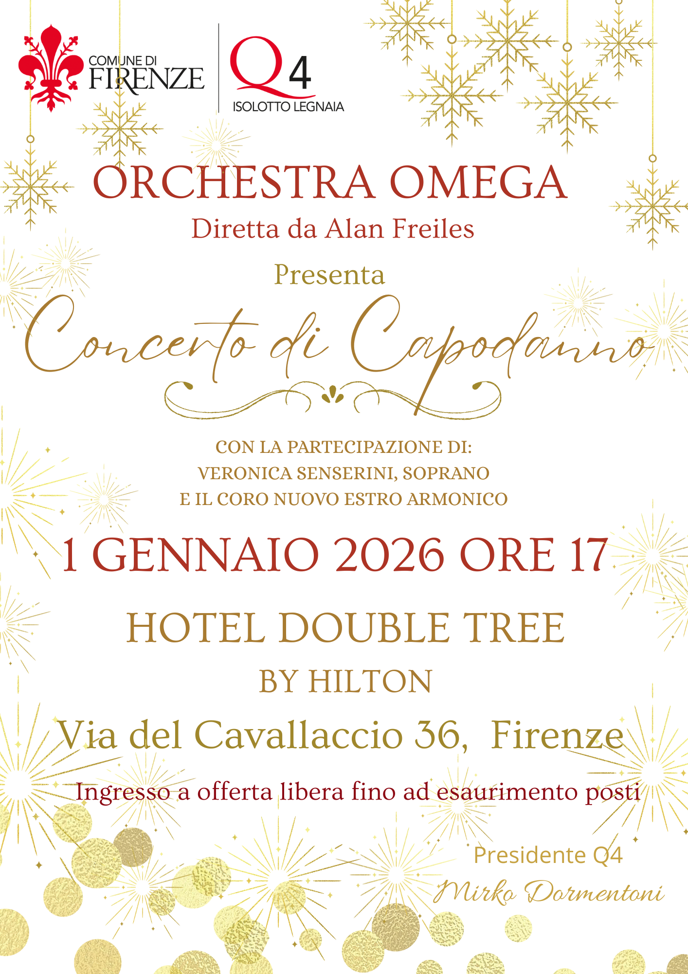 Il Quartiere 4 inaugura il nuovo anno con un appuntamento musicale di grande fascino. Giovedì 1° gennaio 2026, alle ore 17, l’elegante cornice dell’Hotel Double Tree by Hilton Via del Cavallaccio 36 ospiterà il Concerto di Capodanno dell’Orchestra Omega, diretta dal maestro Alan Freiles con la partecipazione della Soprano Veronica Senserini e il coro Nuovo Estro Armonico.
