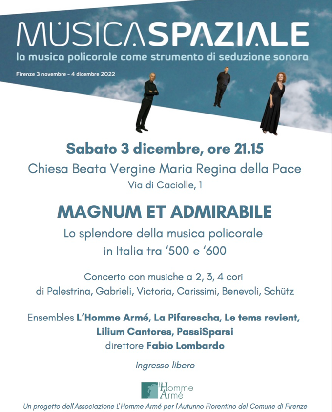 Il concerto prevede musiche di Palestrina, G. Carissimi, G. Gabrieli, O. Benevoli, T. L. de Victoria, H. Schutz, eseguite da un supergruppo diretto da Fabio Lombardo e composto da alcune eccellenze vocali dell’ensemble L’Homme Armè , dei PassiSparsi, de Le tems revient e dei Lilium Cantores, oltre all’ensamble strumentale La Pficarescha.