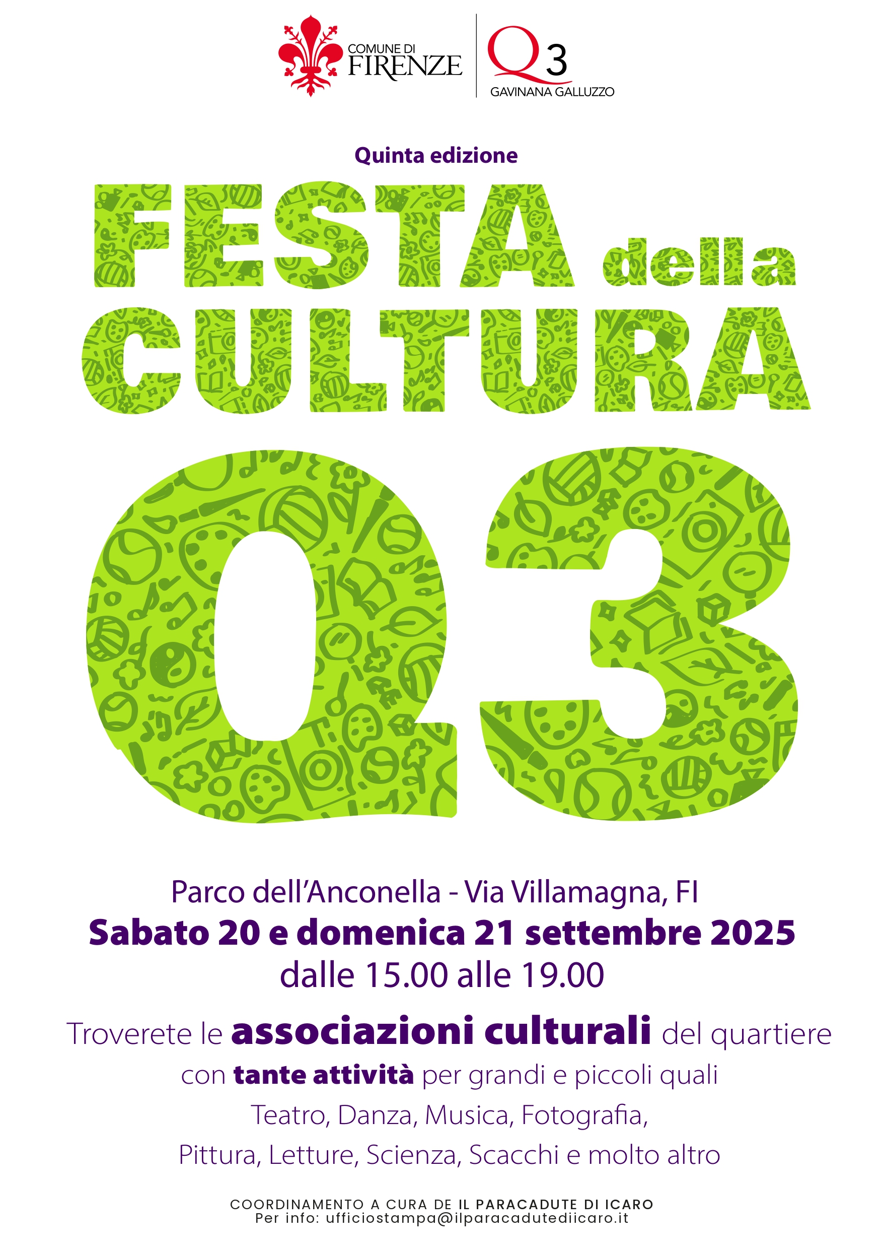 Anche quest’anno il Quartiere 3 organizza, con il coordinamento dell’associazione Il Paracadute di Icaro, la quinta edizione della Festa della Cultura, nella ferma convinzione che le attività culturali siano un fattore imprescindibile di crescita, inclusione, occupazione e senso di comunità.
