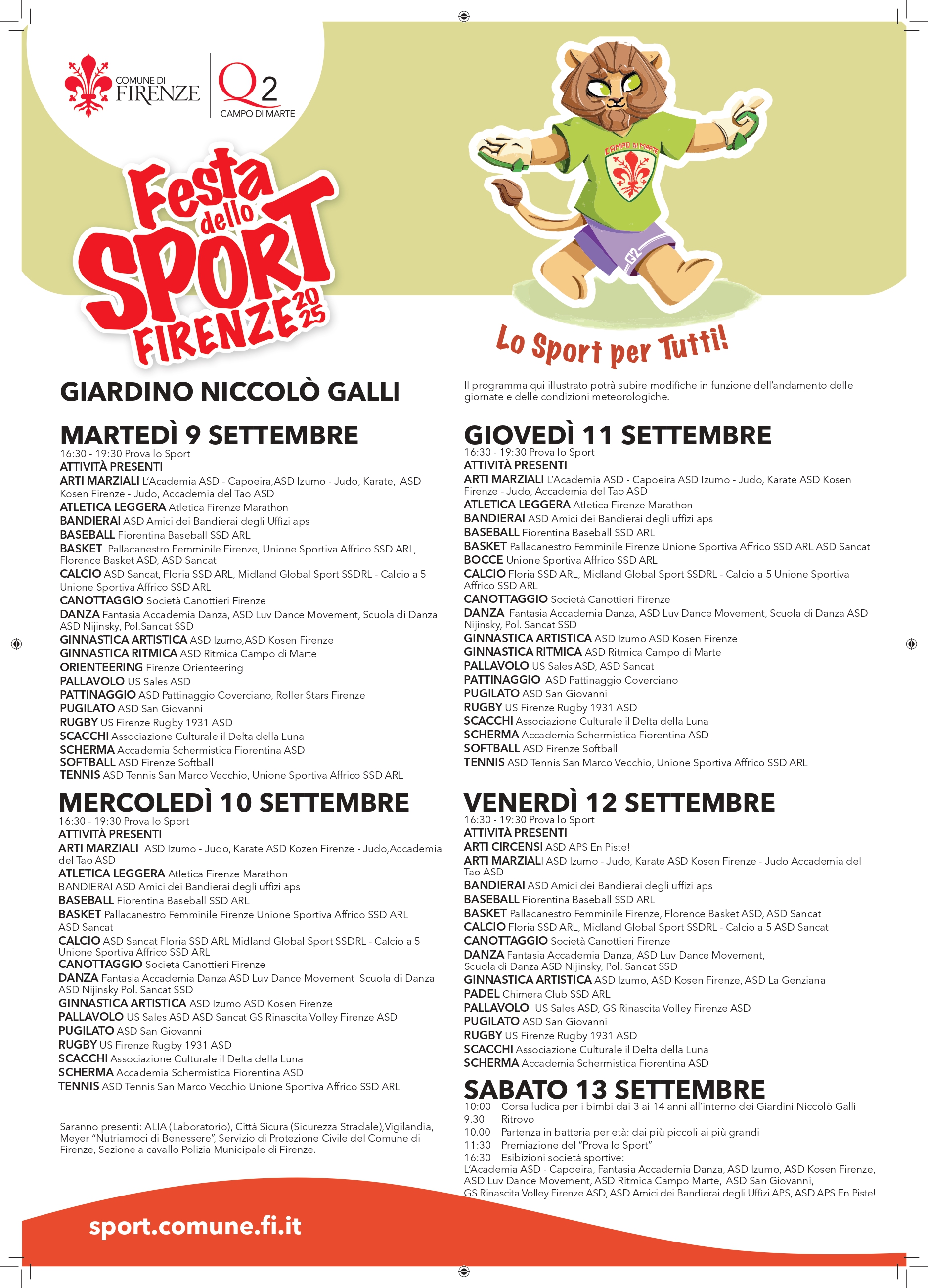 Torna al Quartiere 2 la tradizionale Festa della Sport, l’iniziativa che animerà i parchi e gli impianti sportivi della città proponendo, come ogni anno, prove di sport per bambini e ragazzi, esibizioni ed altre iniziative, con il concorso di molte associazioni sportive del territorio e il coordinamento dell’assessorato allo sport del Comune di Firenze e delle Commissioni Sport dei cinque Quartieri.