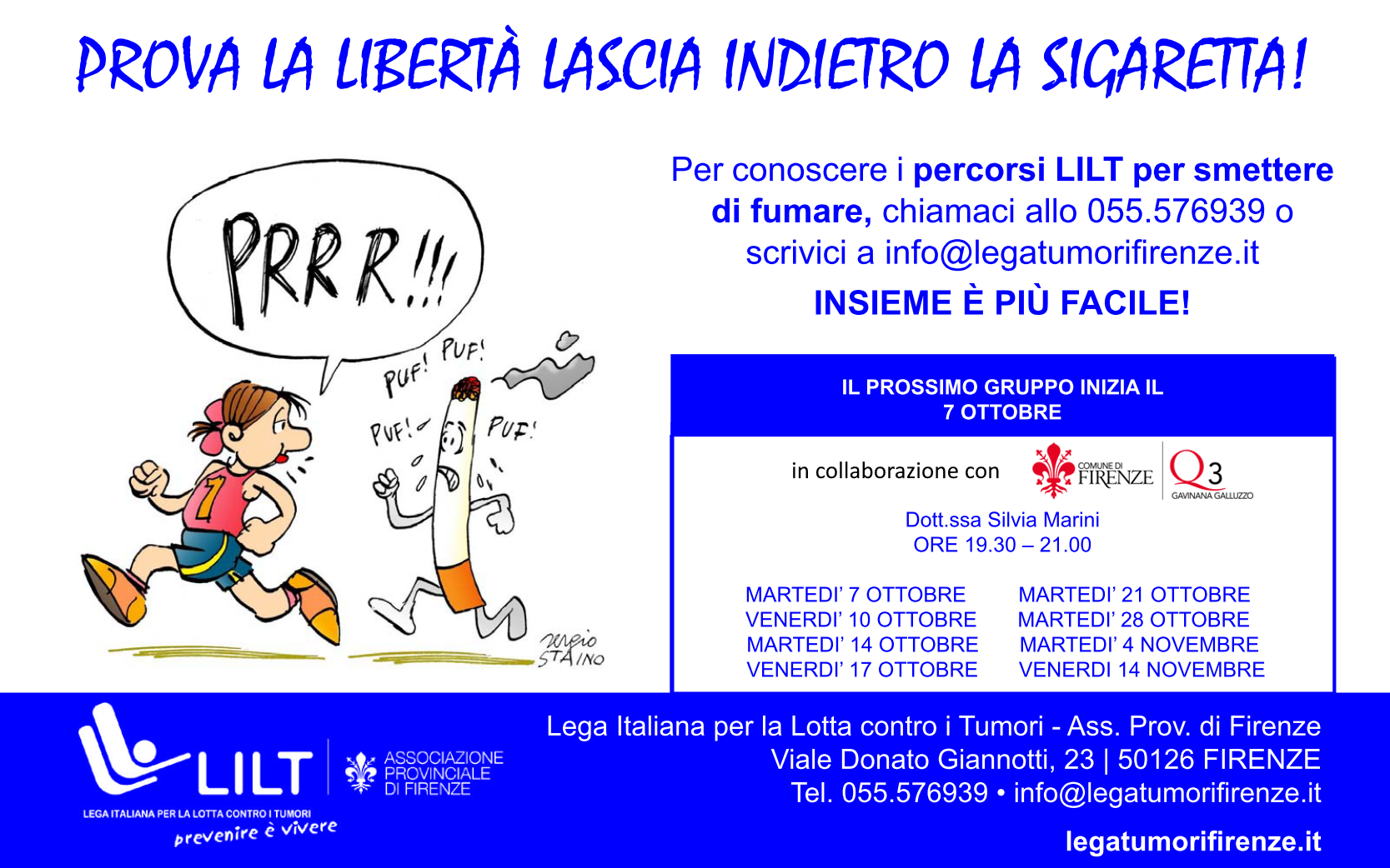 La LILT - Lega Italiana Lotta ai Tumori, ass. Provinciale di Firenze - organizza degli incontri di gruppo presso la propria sede (in viale D. Giannotti, 23 - Firenze) per smettere di fumare. Il primo incontro si terrà martedì 7 ottobre dalle ore 19:30 alle ore 21:00.