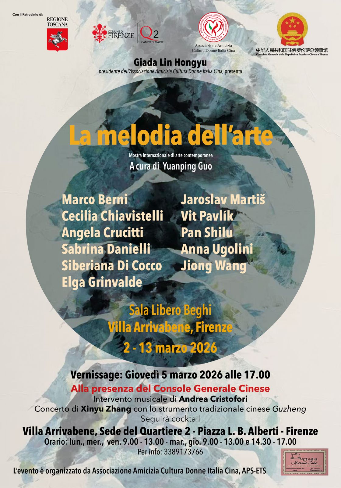 Nuova mostra in esposizione nella sala Libero Beghi in Villa Arrivabene, dal titolo "La melodia dell'arte", a cura di Yuanping Guo e organizzata dall'Associazione Amicizia Cultura Donne Italia Cina con il patrocinio della Regione Toscana e la collaborazione del Quartiere 2.