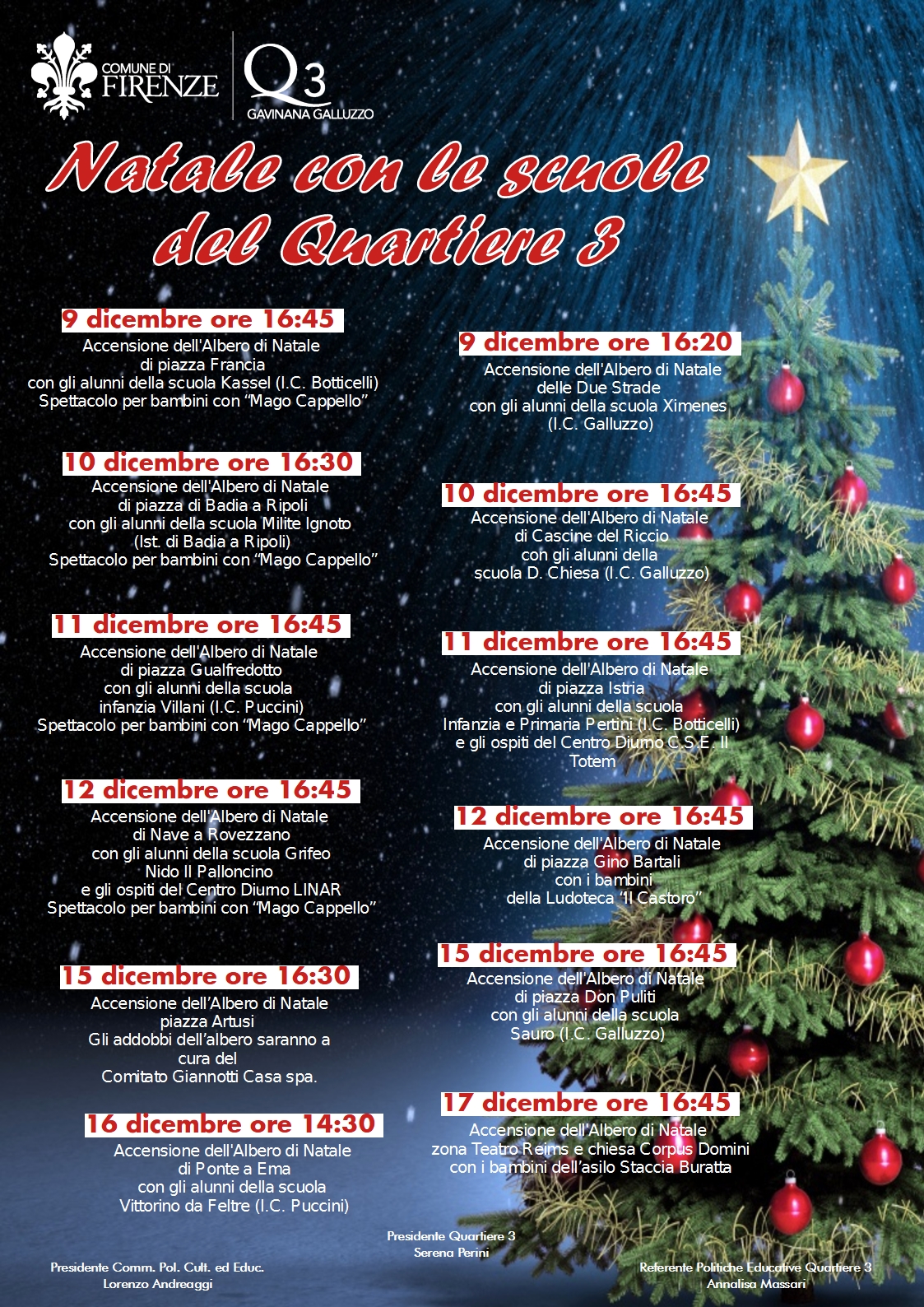 • 10 dicembre ore 16:45 Accensione dell'Albero di Natale di Cascine del Riccio con gli alunni della scuola D. Chiesa (I.C. Galluzzo)