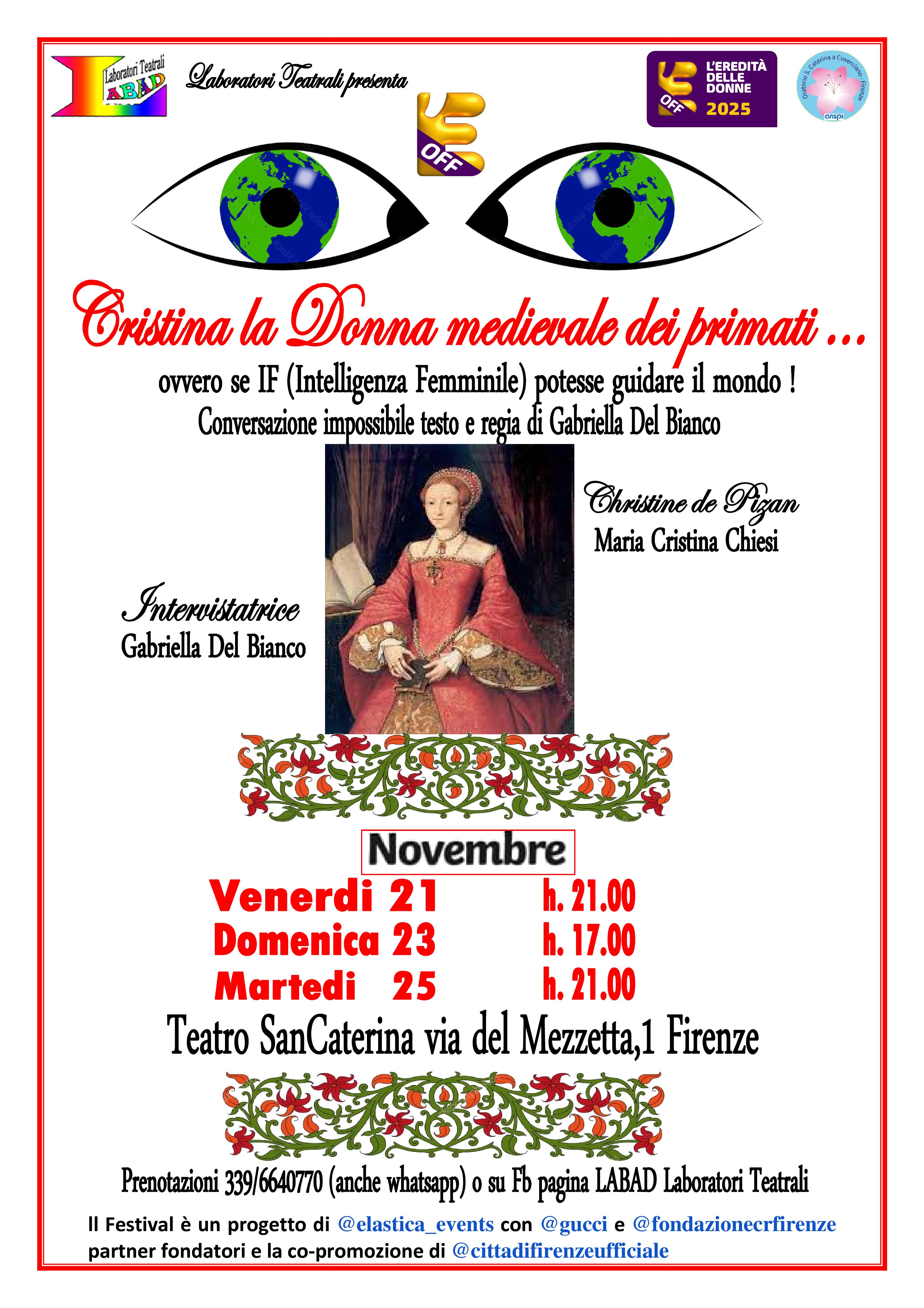 Nuovo spettacolo teatrale in programma al teatro SanCaterina, a cura di Labad Laboratori Teatrali e inserito nel Festival Eredità delle Donne; un atto unico scritto e diretto da Gabriella Del Bianco con Maria Cristina Chiesi che ripercorre