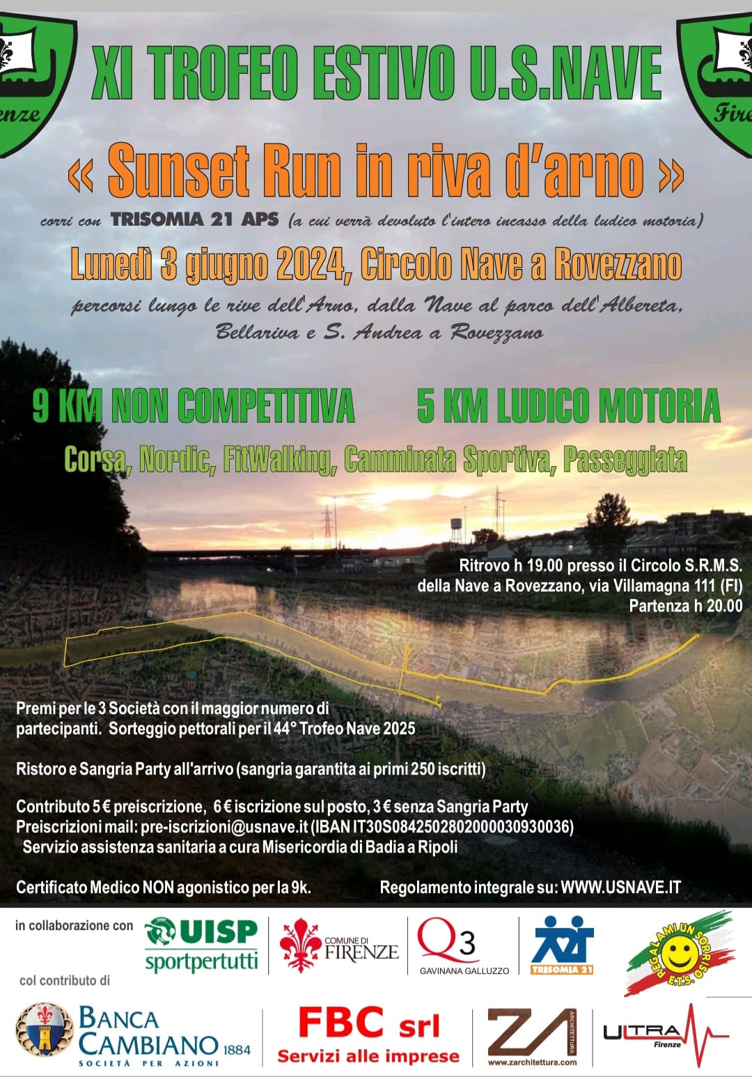 Lunedì 3 giugno si svolgerà l'11° trofeo estivo "Sunset Run in riva d'Arno" della US Nave con ritrovo alle ore 19:00 al Circolo S.R.M.S. della Nave a Rovezzano (via di Villamagna, 111) e partenza alle ore 20:00.