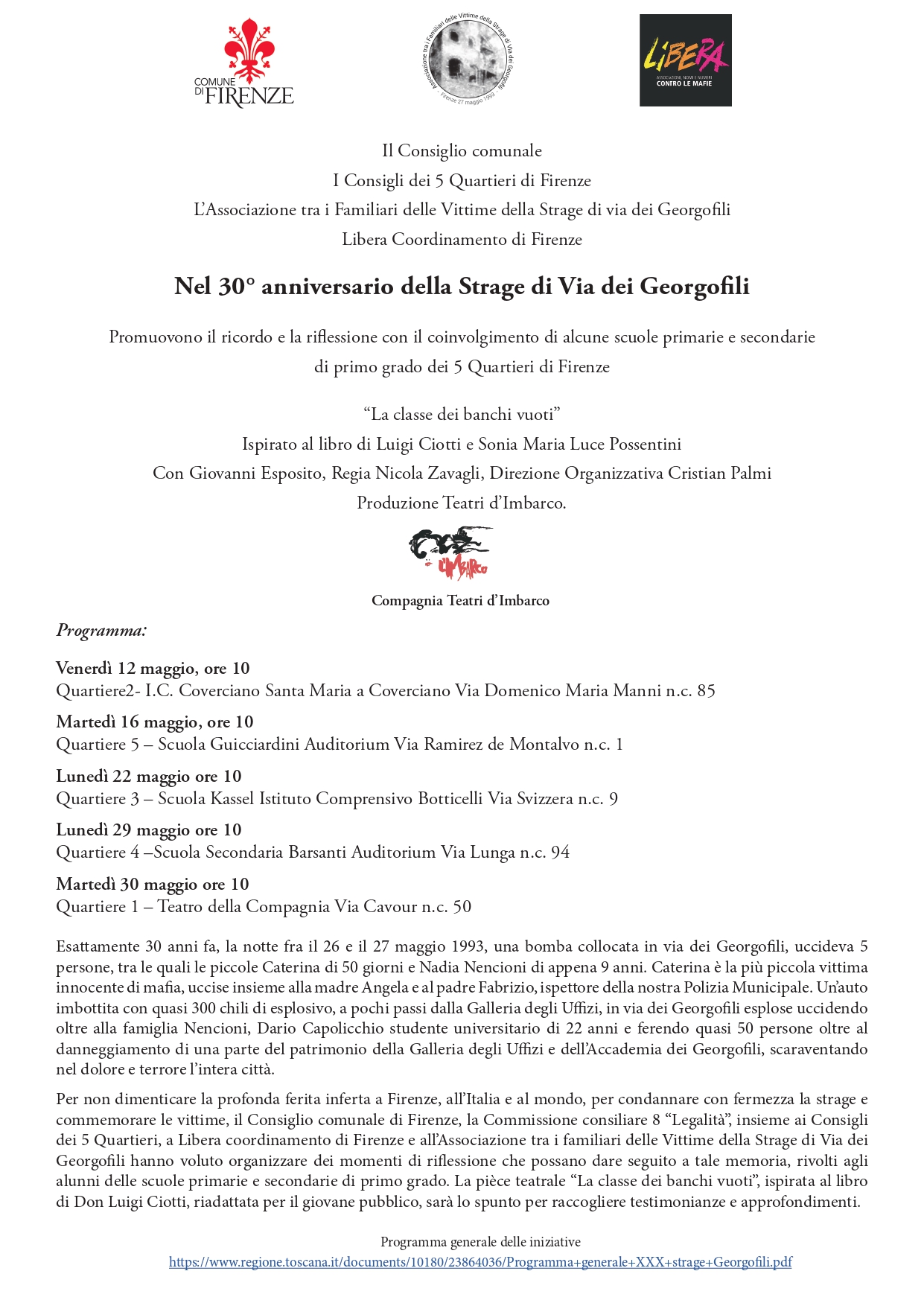 Il Consiglio Comunale ed i Consigli dei cinque Quartieri promuovono il ricordo e la riflessione nell'Anniversario della strage che contò quasi cinquanta feriti e cinque vittime, tra cui quella che è a tutt'oggi la più piccola vittima innocente di mafia. Di seguito il programma delle commemorazioni.