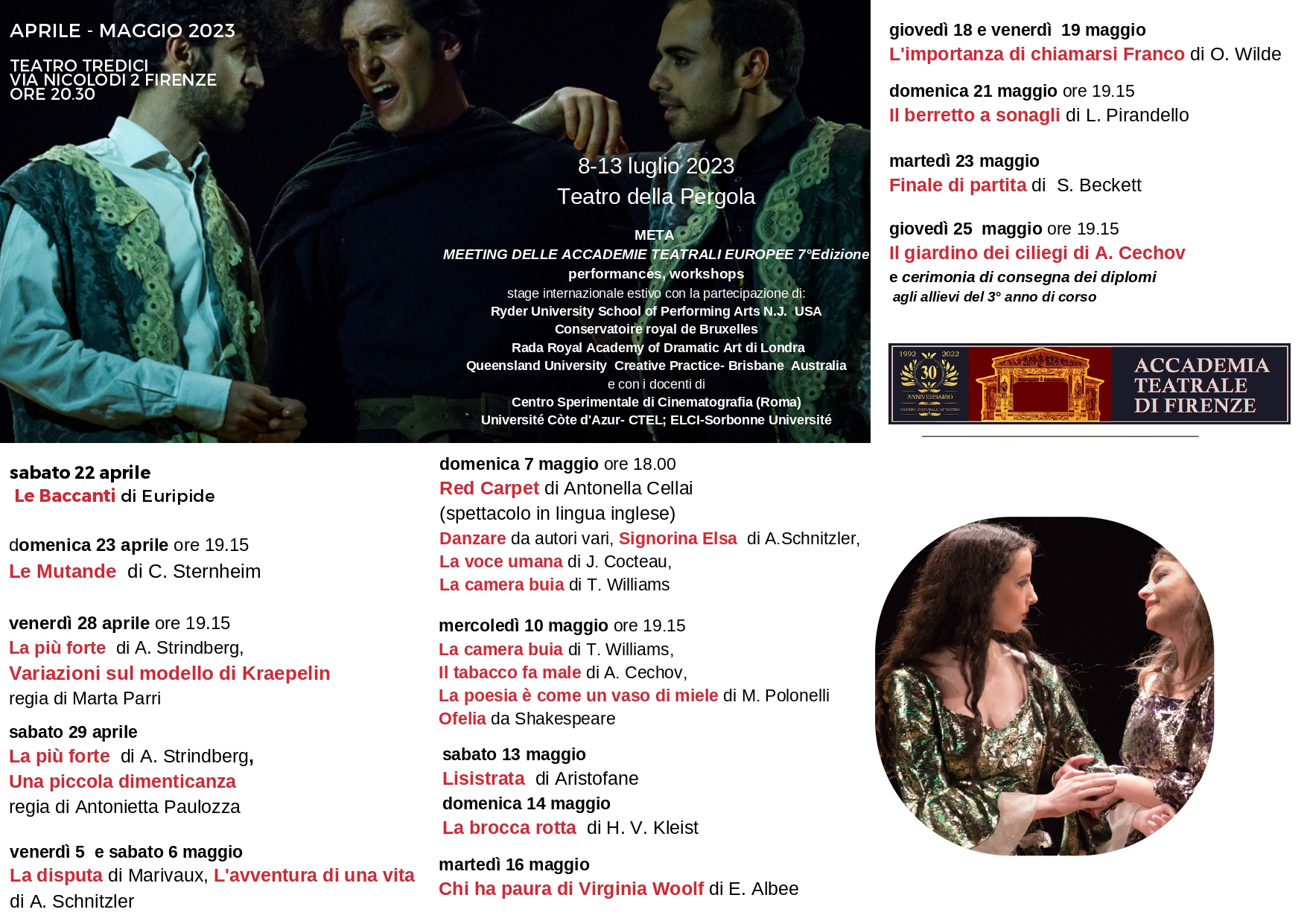 Torna con la 30° edizione la rassegna teatrale "Sere a Teatro", a cura dell'Accademia teatrale di Firenze, dal 22 Aprile al 25 Maggio per una stagione ricca di performance e spettacoli.