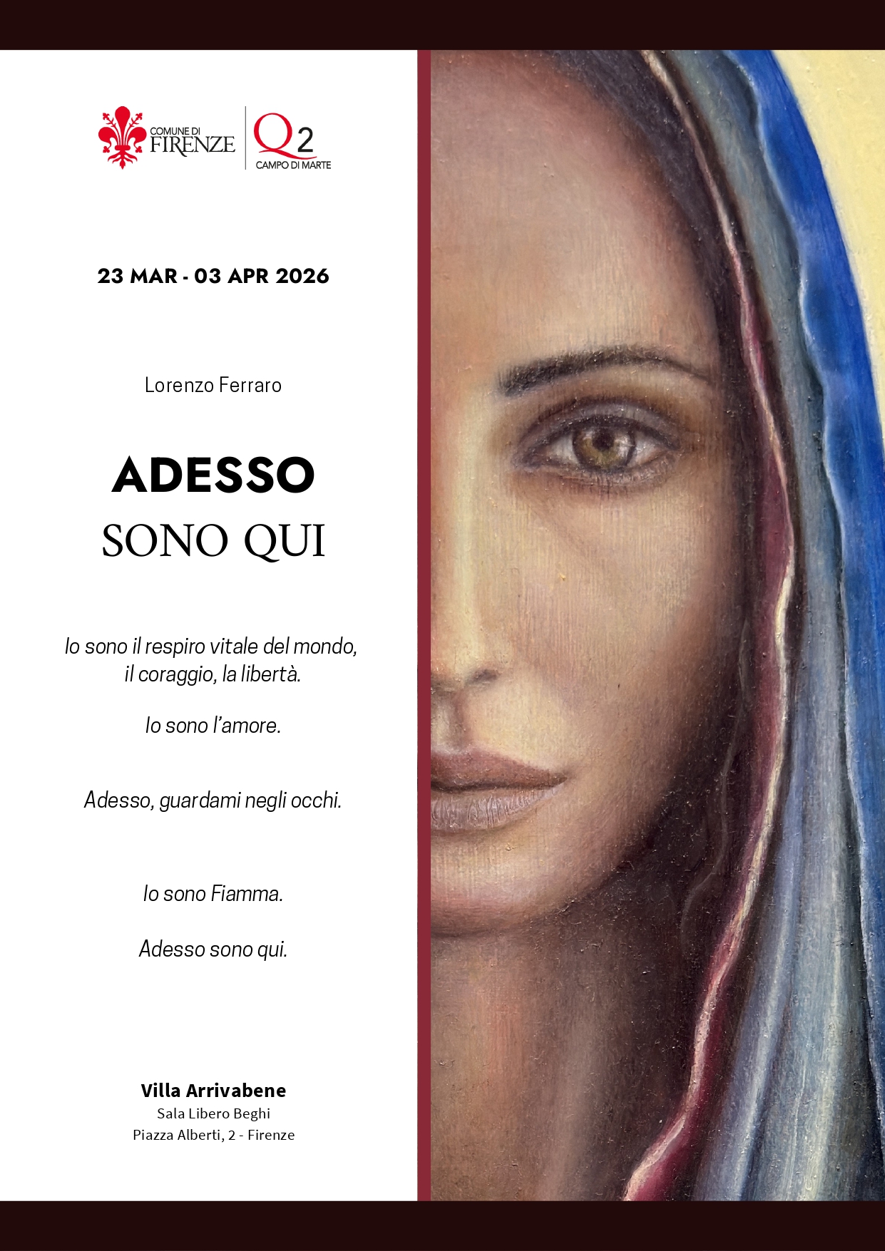 Nuova mostra in esposizione nella Sala Libero Beghi in Villa Arrivabene, dal titolo "Adesso sono qui", a cura di Lorenzo Ferraro con la collaborazione del Quartiere 2. Un'esposizione che vuole rappresentare un’anticamera metafisica il cui significato è legato al percepire, al passaggio, al cambiamento; oltrepassando la porta si apre un nuovo spazio, dove l’azione viene scandita da un impulso profondo e preciso, e un sentimento divino dà vita a una creazione più alta. Tra i dipinti vi sono interpretazioni personali di opere del Botticelli, richiamo alla bellezza e al sentimento più nobile manifestato a Firenze nel periodo rinascimentale; tutte le cornici presenti sono realizzate artigianalmente. L’esposizione diventa metafora di un’esperienza personale e trascendentale che può essere recepita e inconsciamente fatta propria da ogni visitatore.