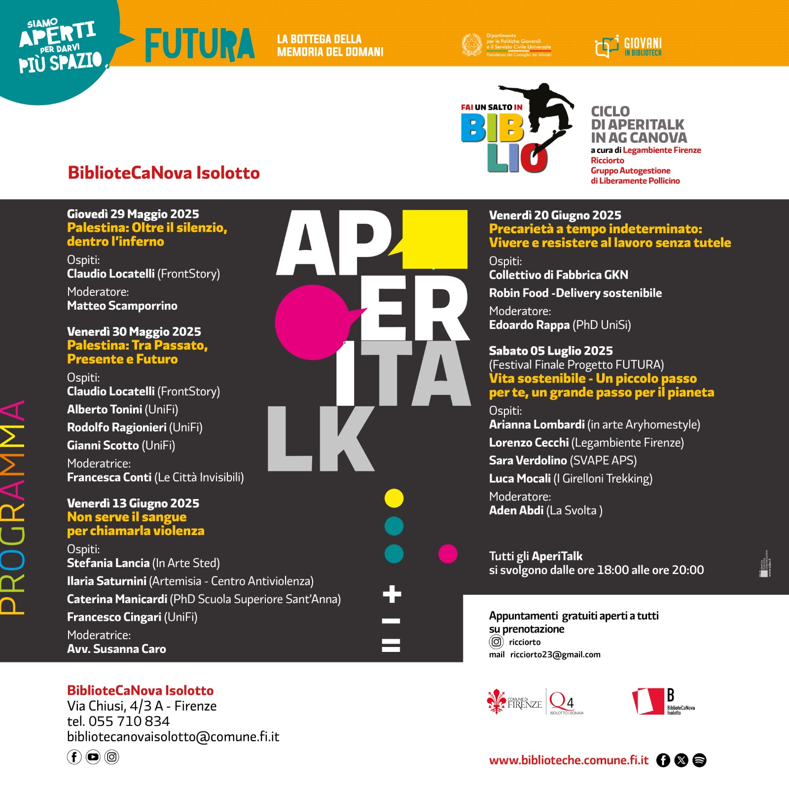 Tutti gli AperiTalk sono gratuiti e su prenotazione, e si propongono come momenti di cittadinanza attiva, per riflettere, imparare e costruire nuove forme di partecipazione consapevole.