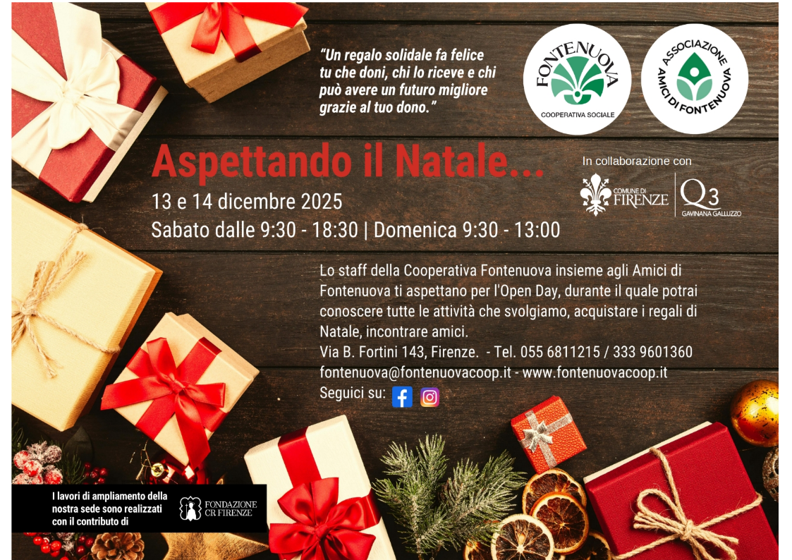 Sabato 13 dicembre dalle ore 9:30 alle ore 18:30 e domenica 14 dicembre dalle ore 9:30 alle 13 si svolgeranno due giorni di open day della Cooperativa Fontenuova (via Benedetto Fortini, 143 - Firenze): lo staff della cooperativa illustrerà tutte le attività che vengono svolte e sarà possibile acquistare i loro prodotti.
