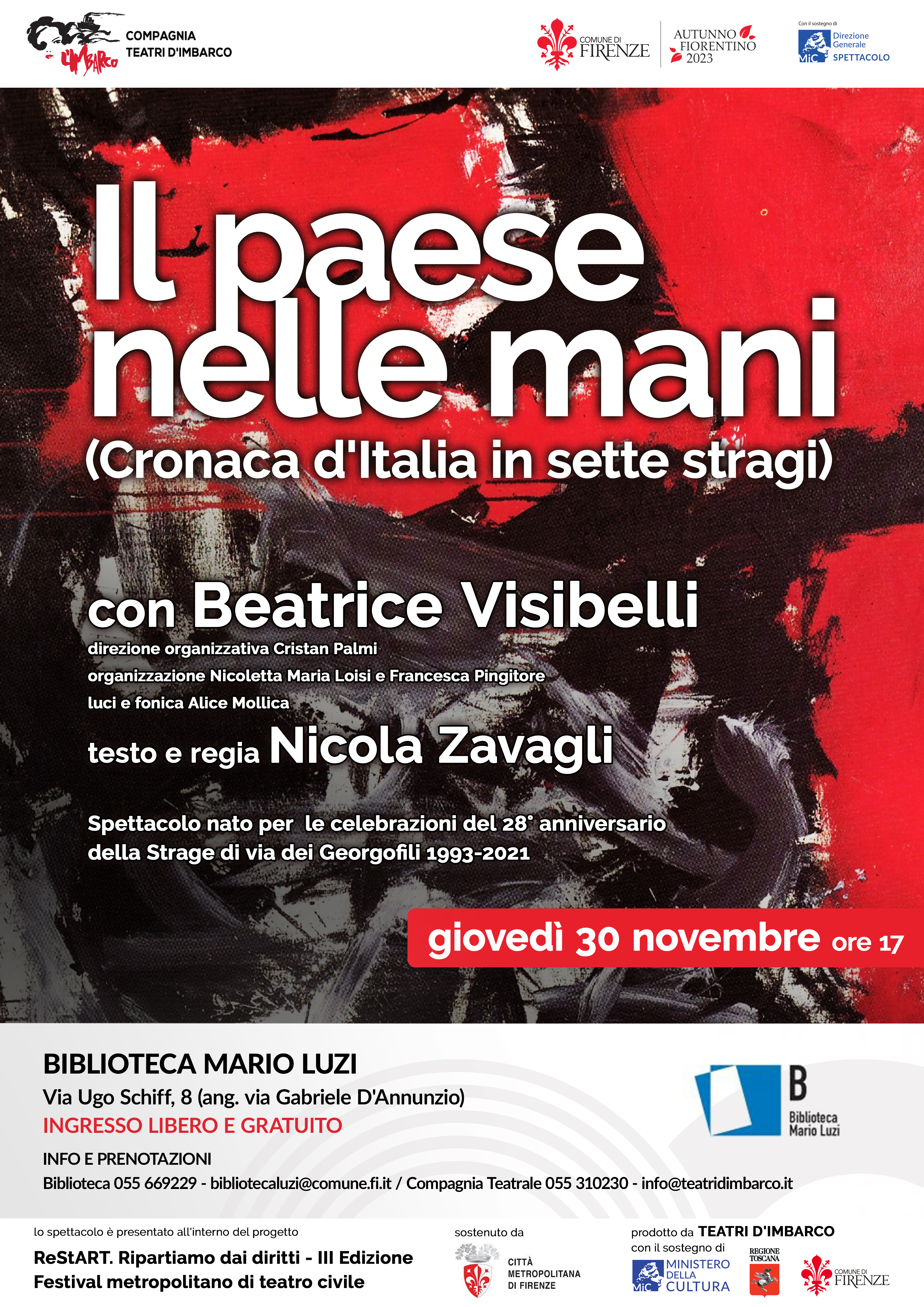 Tutti gli eventi sono ad ingresso libero e gratuito; per maggiori informazioni contattare direttamente la Biblioteca Luzi (055669229 - bibliotecaluzi@comune.fi.it) o la Compagnia Teatri d'Imbarco (055310230 - info@teatridimbarco.it).