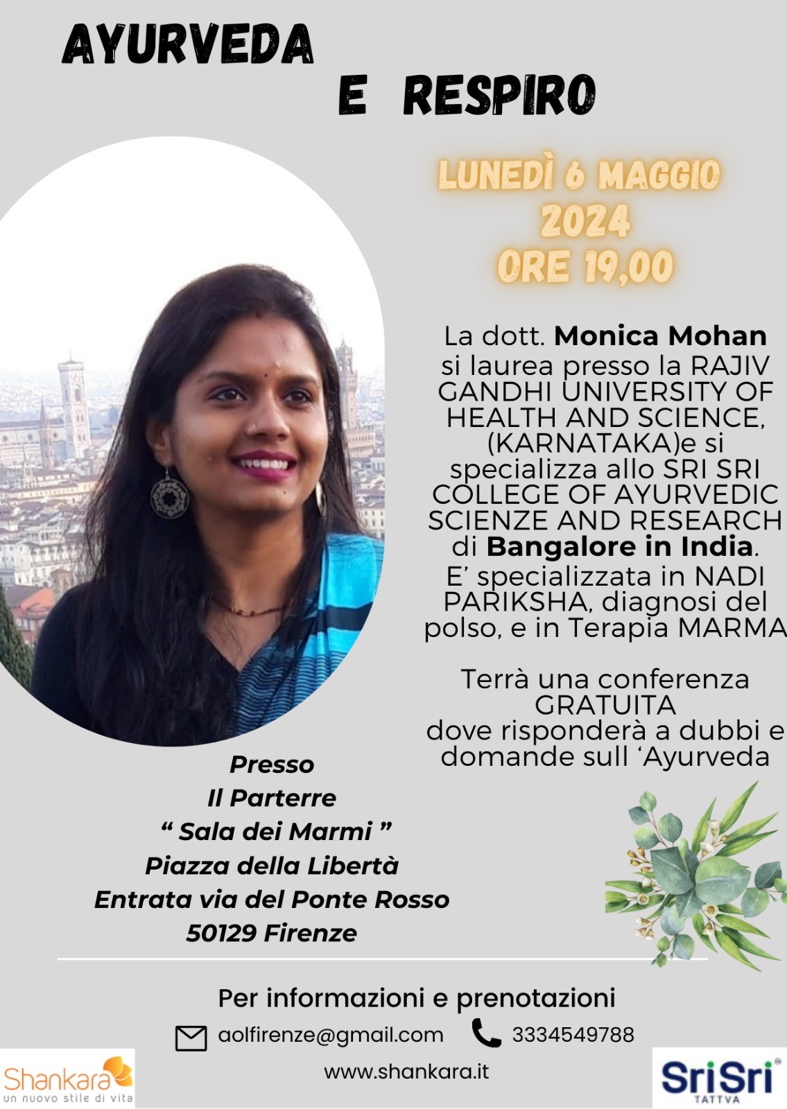 Lunedì 6 maggio alle ore 16:00 ,presso la Sala dei Marmi - Parterre, avrà luogo una conferenza per parlare dell'Ayurveda, medicina tradizionale indiana, a cura della dott.ssa Monica Mohan.