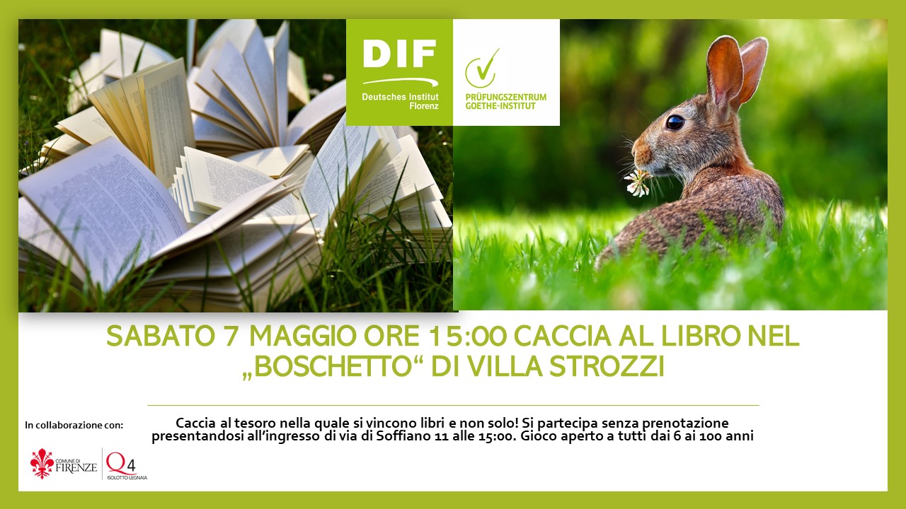 Sabato 7 maggio, dalle 15 alle 18, nel Parco di Villa Strozzi (Boschetto), entrata da via di Soffiano 11, il Deutsches Institut Florenz organizza una 'Caccia al libro', gioco a premi per la promozione della lettura e dell'amore per la natura, in collaborazione con il Quartiere 4.