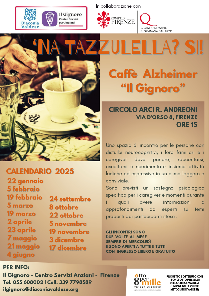 Sarà attivo anche nel 2025 il "Caffè Alzheimer ‘Na Tazzulella" organizzato dal centro servizi per anziani CSD “Il Gignoro” in collaborazione con i Quartieri 2 e 3 del Comune di Firenze: lo scopo è ottenere uno spazio di incontro per le persone con disturbi neurocognitivi, i loro familiari ed i loro caregiver dove poter parlare, raccontarsi ed ascoltarsi. Il Caffè Alzheimer è un primo sostegno per le famiglie ed un punto di contatto con tutti gli altri servizi socio-sanitari rivolti alle persone con demenza. Saranno sperimentate attività ludiche ed espressive in un clima leggero e conviviale. Sono previsti un sostegno psicologico specifico per i caregiver e momenti durante i quali avere informazioni o approfondimenti da esperti su temi proposti dai partecipanti stessi.