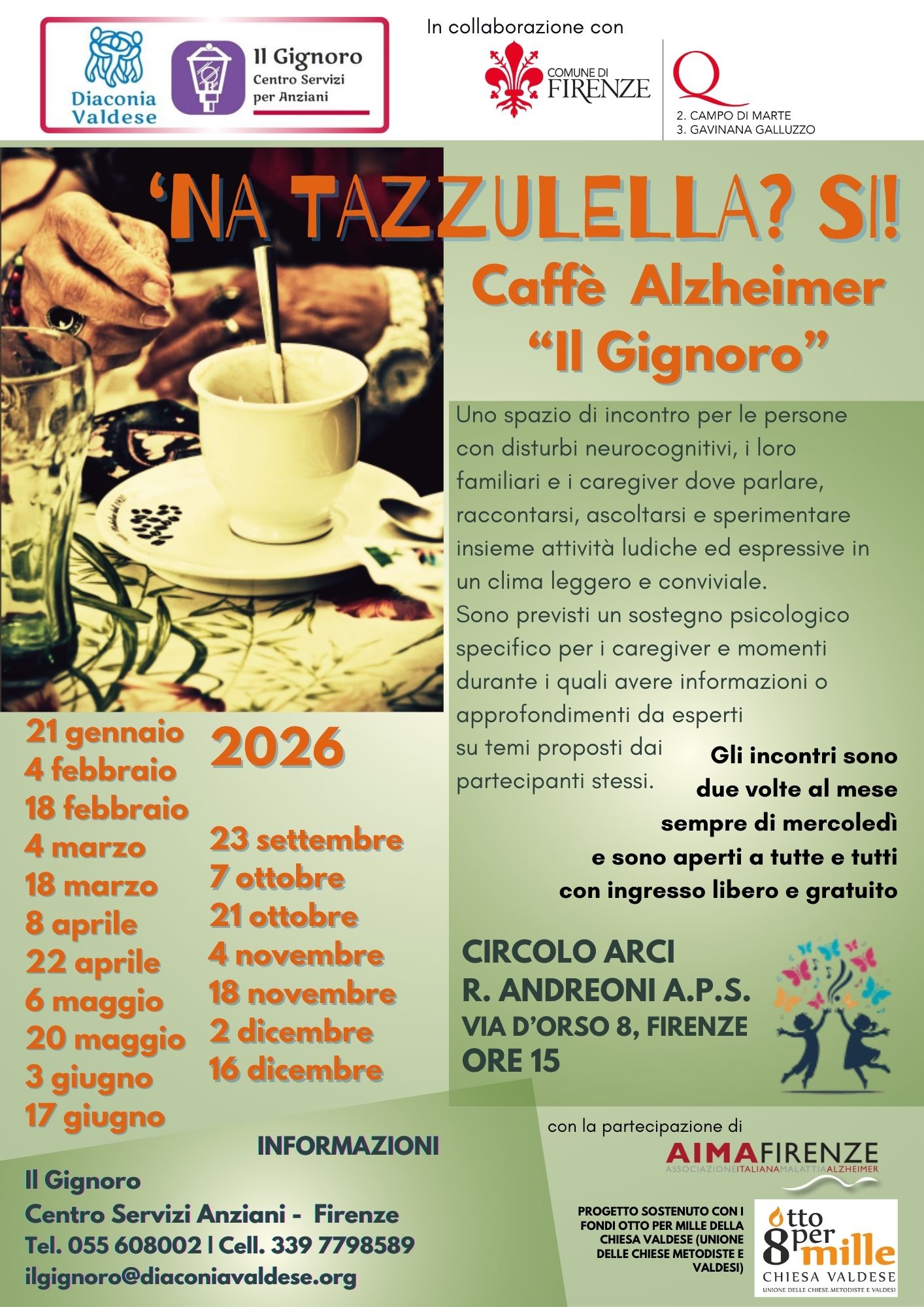 Sarà attivo anche nel 2026 il "Caffè Alzheimer ‘Na Tazzulella" organizzato dal centro servizi per anziani CSD “Il Gignoro” in collaborazione con i Quartieri 2 e 3 del Comune di Firenze: lo scopo è ottenere uno spazio di incontro per le persone con disturbi neurocognitivi, i loro familiari ed i loro caregiver dove poter parlare, raccontarsi ed ascoltarsi. Il Caffè Alzheimer è un primo sostegno per le famiglie ed un punto di contatto con tutti gli altri servizi socio-sanitari rivolti alle persone con demenza. Saranno sperimentate attività ludiche ed espressive in un clima leggero e conviviale. Sono previsti un sostegno psicologico specifico per i caregiver e momenti durante i quali avere informazioni o approfondimenti da esperti su temi proposti dai partecipanti stessi.