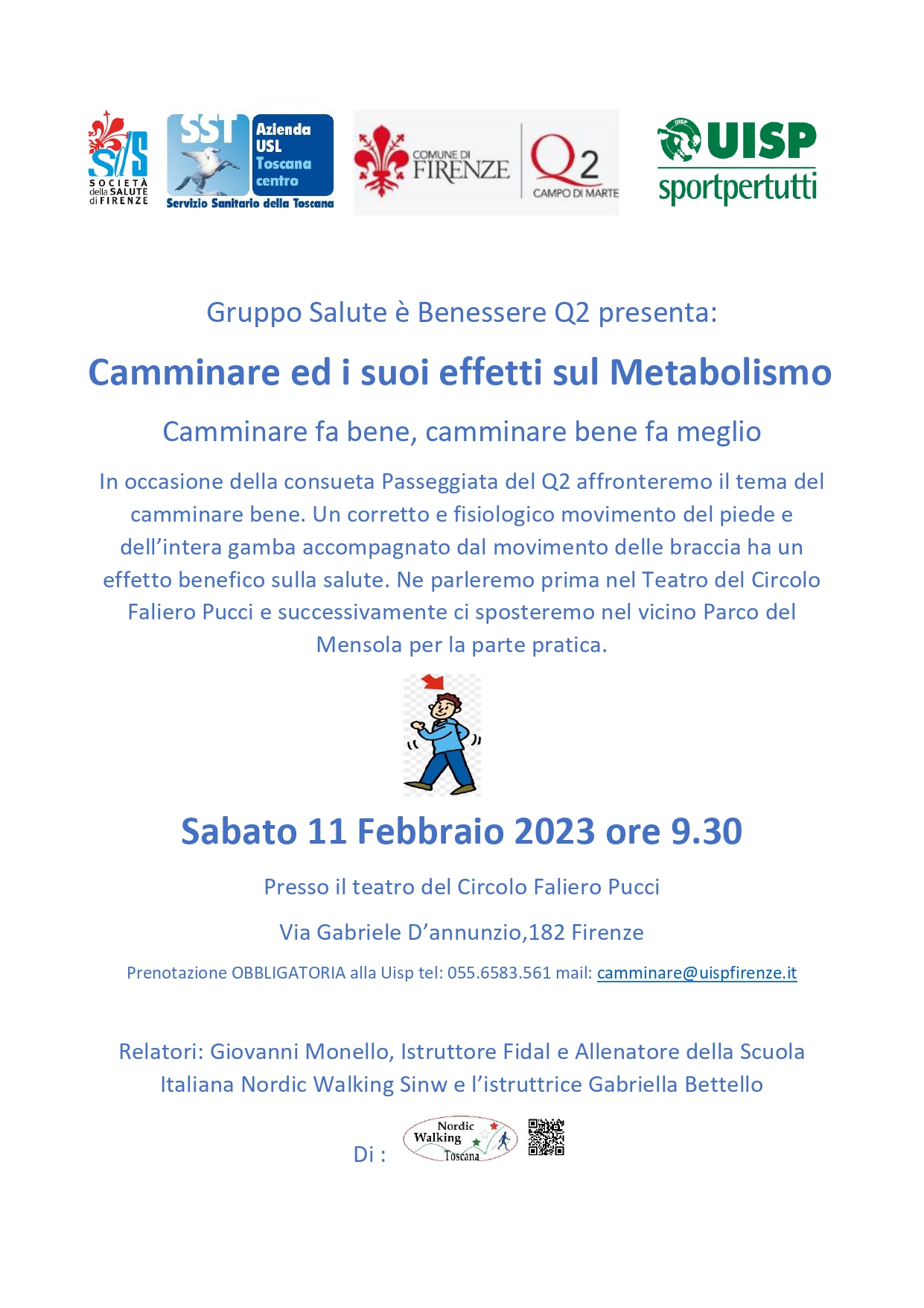 Sabato 11 Febbraio alle ore 9.30, presso il Circolo Faliero Pucci in Via D'annunzio n.182, si terrà l'evento "Camminare e i suoi effetti sul metabolismo", a cura del Gruppo "Salute è Benessere" del Quartiere 2, nel quale, in occasione della consueta passeggiata, verrà affrontato il tema del camminare bene e dell'effetto benefico sulla salute di un corretto e fisiologico movimento del piede e dell’intera gamba.
