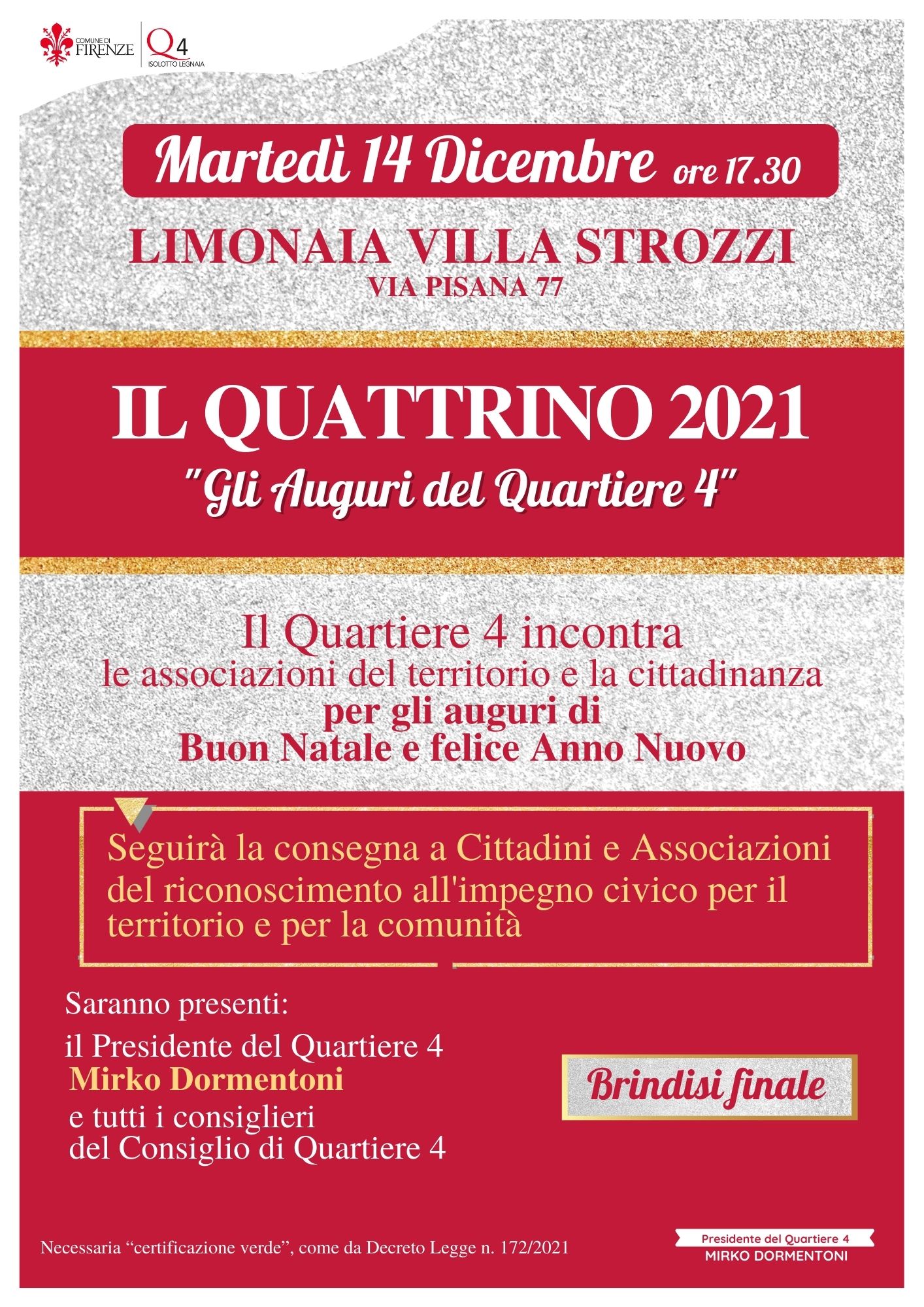 Il presidente del Quartiere 4 farà un breve bilancio dell'anno insieme ai cittadini e alle associazioni del territorio. Seguirà la consegna dei riconoscimenti “Il Quattrino”.
