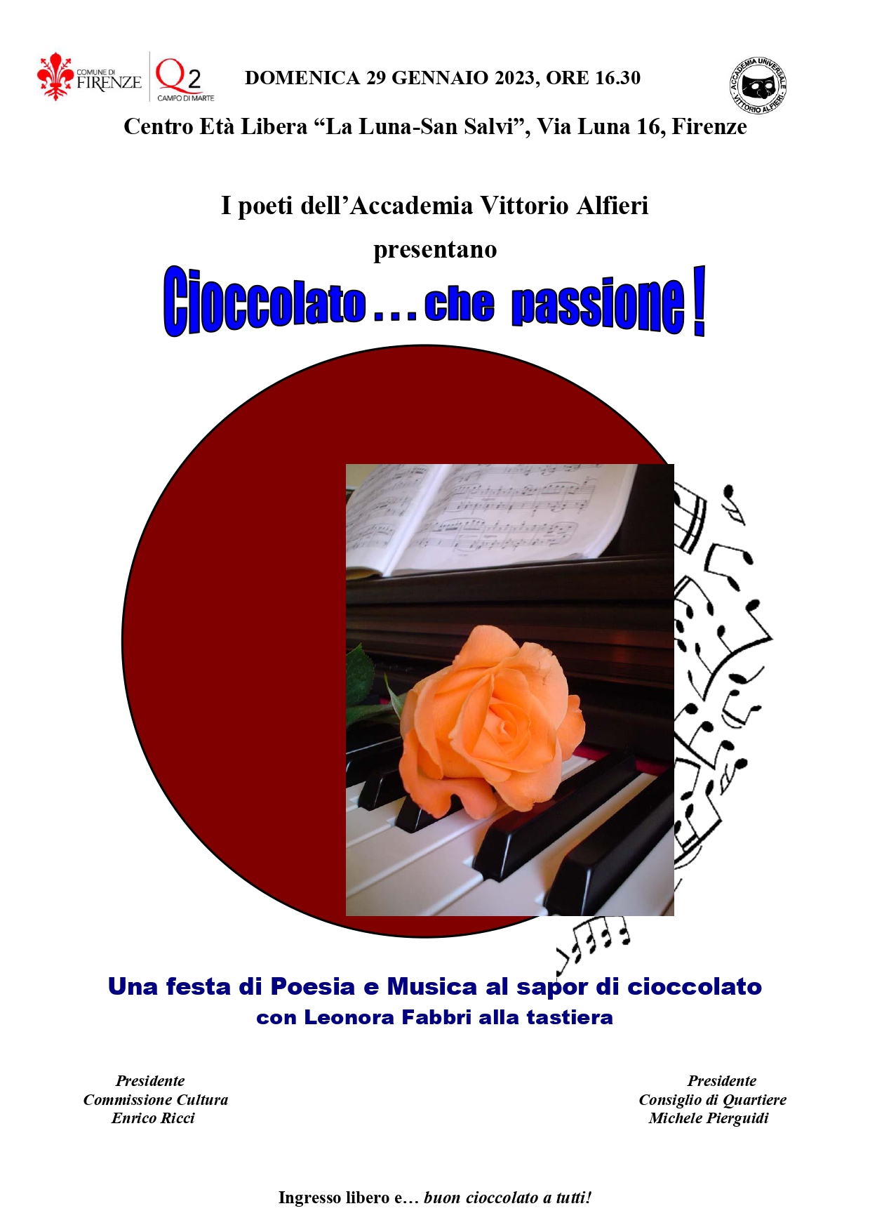 Domenica 29 Gennaio alle ore 16.30, presso il Centro Età Libera La Luna-San Salvi, si terrà l'edizione 2023 dell'evento ad ingresso libero e gratuito "Cioccolato... Che passione!", organizzato dall'Accademia Vittorio Alfieri con la collaborazione del Quartiere 2. Una festa di poesia e musica, al sapor di cioccolato, presentata dai poteri dell'Accademia con la partecipazione di Leonora Fabbri alla tastiera.