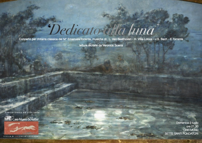 La chitarra classica del Maestro Emanuele Torrente suonerà 'Al Chiaro di luna' di L.W. Beethoven ed altre brani classici altrettanto suggestivi, accompagnati da letture di poesie e pensieri ispirati dalla luna; alla fine sarà possibile ammirare presso Casa Museo Schlatter, a pochi passi della chiesa, il quadro uscito dai depositi del museo solo per questa occasione.