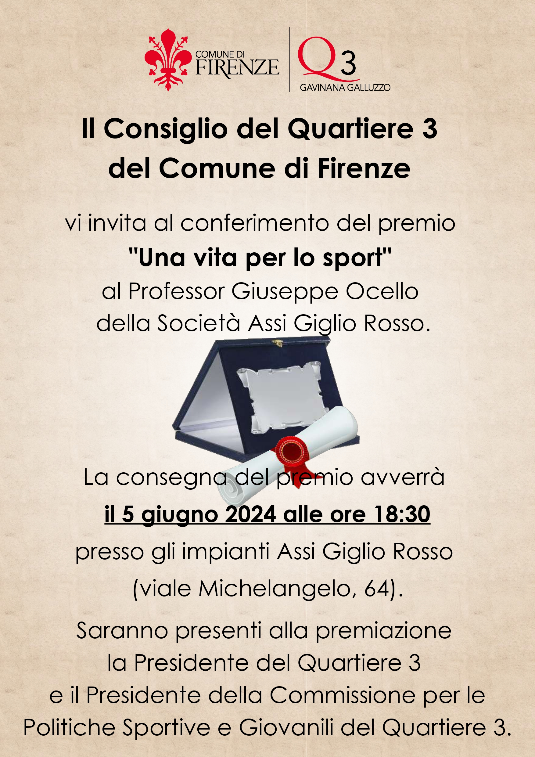Il Consiglio del Quartiere 3 del Comune di Firenze vi invita al conferimento del premio "Una vita per lo sport" al Professor Giuseppe Ocello della Società Assi Giglio Rosso. La consegna del premio avverrà il 5 giugno 2024 alle ore 18:30 presso gli impianti Assi Giglio Rosso (viale Michelangelo, 64).