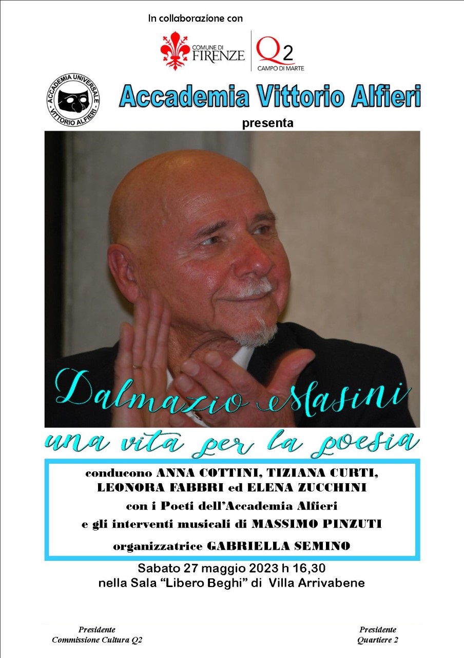 Sabato 27 Maggio alle ore 16.30, nella Sala Libero Beghi in Villa Arrivabene, si terrà l'evento "Dalmazio Masini - Una vita per la poesia" dedicato al poeta e paroliere fiorentino; l'evento, a cura di Gabriella Semino, coordinatrice dell'iniziativa per l'Accademia Alfieri di Firenze, vedrà la partecipazione dei poeti dell'Accademia e gli intermezzi musicali dell'artista Massimo Pinzuti.
