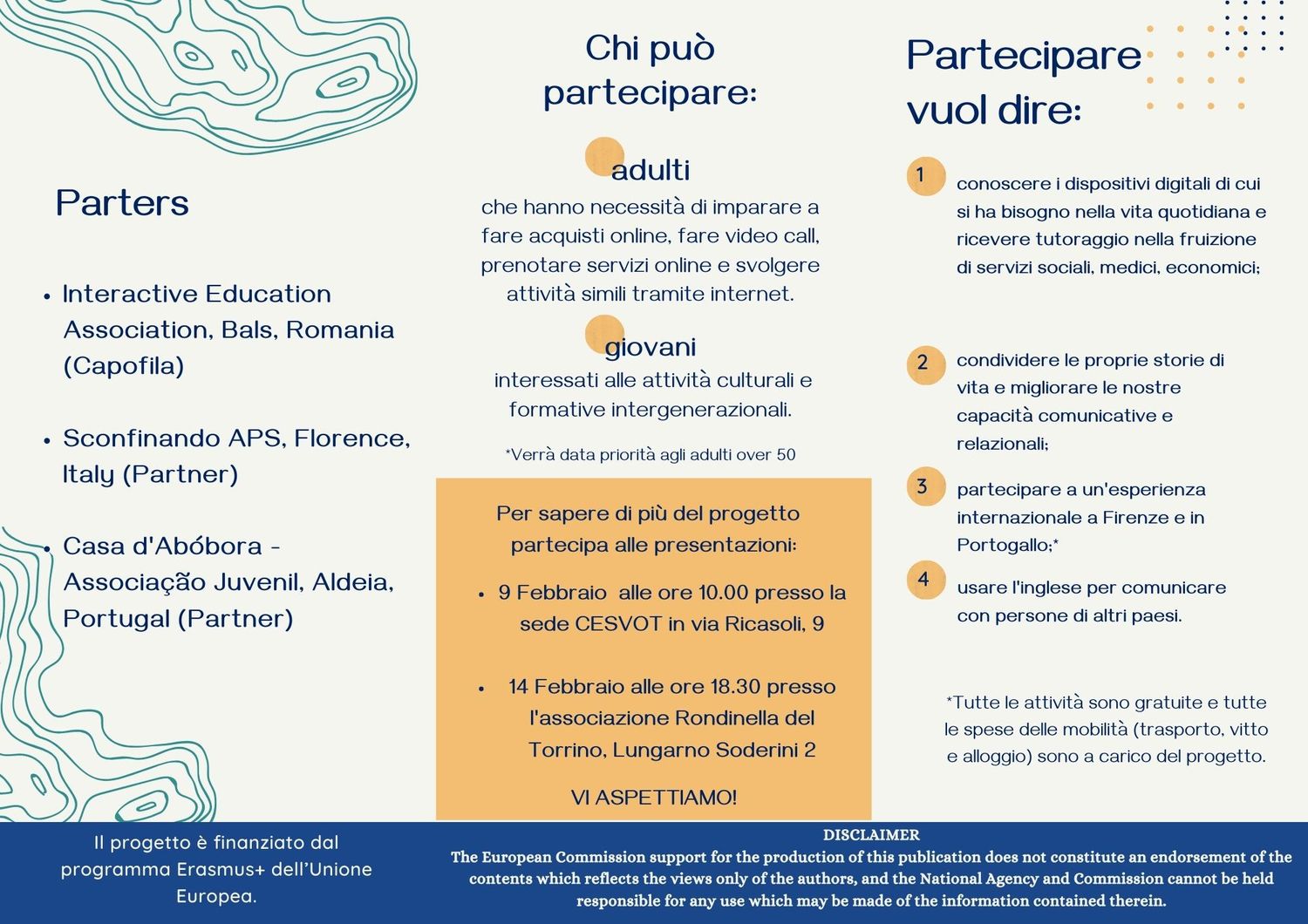 Tante nuove opportunità, a cura dell'APS Sconfinando, per gli over 50, grazie al progetto Erasmus+ "Digital Adult = a Better Life" che offrirà un’opportunità per scoprire il nostro rapporto con gli strumenti digitali. Un progetto che permetterà di offrire opportunità interamente gratuite per partecipare ad attività di socializzazione fornendo un contesto per lo sviluppo di competenze digitali base, nelle quali i partecipanti impareranno a usare le applicazioni dello smartphone e i programmi del computer utili per mantenere e consolidare le proprie relazioni sociali e per facilitare lo svolgimento delle attività quotidiane (acquisti online, prenotazioni, google maps, pagamenti…).