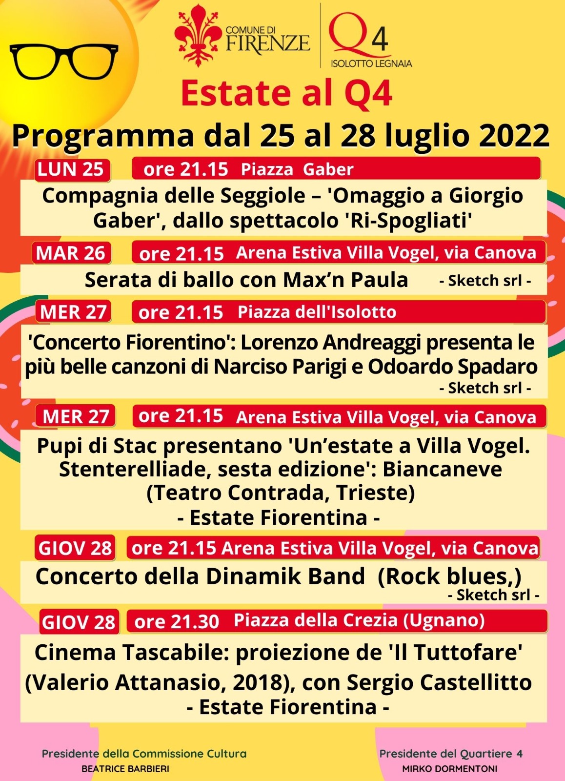 La rassegna di eventi estivi del Quartiere 4 Estate al Q4 prosegue nel Parco di Villa Vogel, in Piazza dell’Isolotto e in Piazza della Crezie con ben 6 appuntamenti, alcuni a cura dell’Estate Fiorentina. Programma: