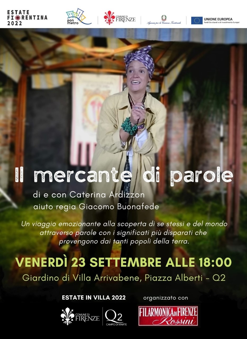 Prosegue la rassegna dell'Estate in Villa Arrivabene con la nuova performance teatrale "Il Mercante di Parole", spettacolo di e con Caterina Ardizzon, ispirato a un racconto di Jean-Claude Carriére e promosso dalla Filarmonica Rossini.