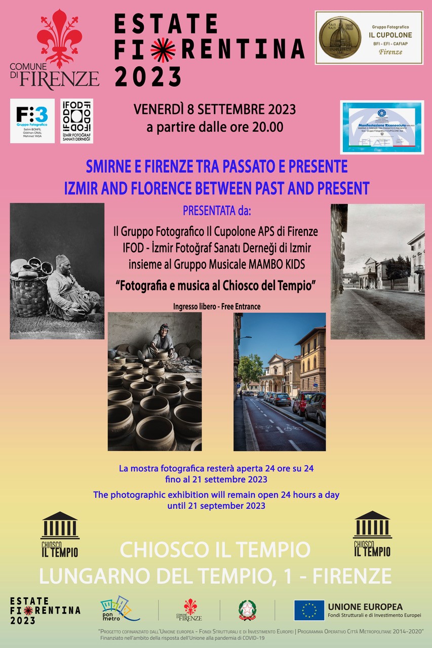 Venerdì 8 Settembre a partire dalle ore 20.00, presso il Chiosco del Tempio nei Giardini Caponnetto, si terrà l'inaugurazione della mostra fotografica "Smirne e Firenze tra passato e presente", realizzata con il contributo dell'Estate Fiorentina dall'A.P.S. Gruppo Fotografico Il Cupolone in collaborazione con il gruppo fotografico turco “IFOD”, nell'ambito della rassegna "Fotografia e musica al Chiosco del Tempio".