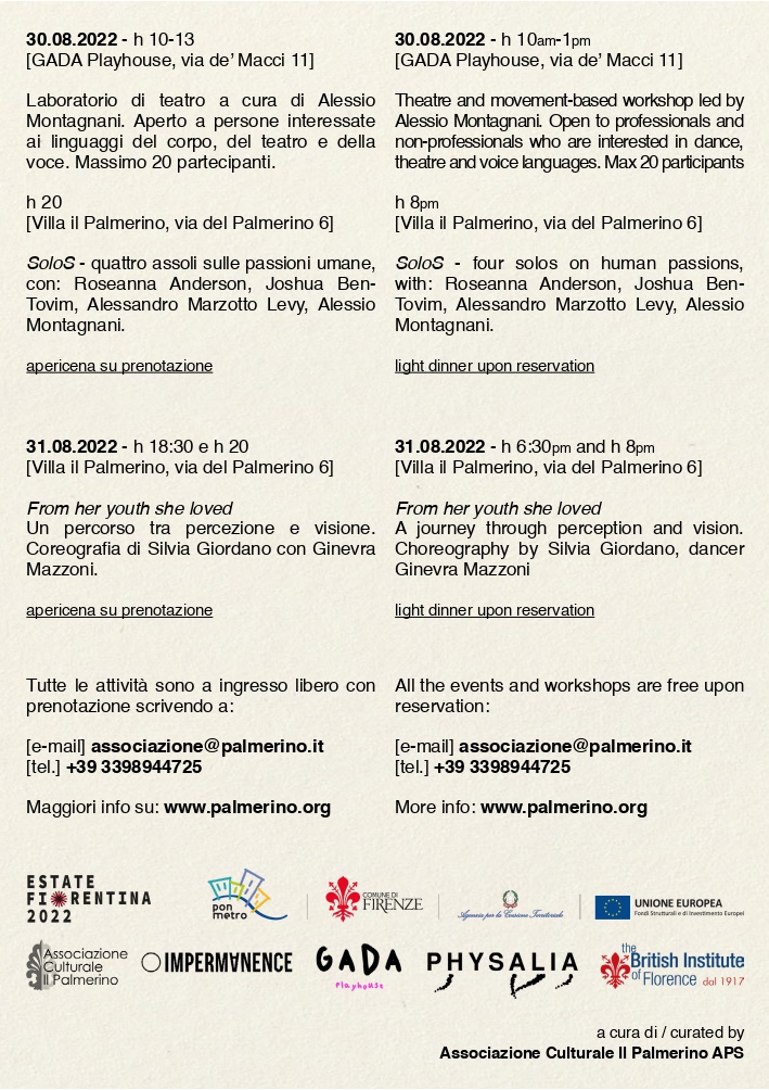 A completare questo ciclo dedicato a Vernon Lee, il 31 agosto si presenterà anche il primo studio di un evento performativo ideato dalla coreografa Silvia Giordano che, con la danzatrice Ginevra Mazzoni, indagherà sulla sfera psicologica dell’intuizione inconscia, guidata dagli studi realizzati da Vernon Lee e dalla sua amica Clementine Anstruther Thomson. Un percorso percettivo ed emotivo che il pubblico potrà vivere in forma d’itinerario coreografico nel giardino di Villa il Palmerino.