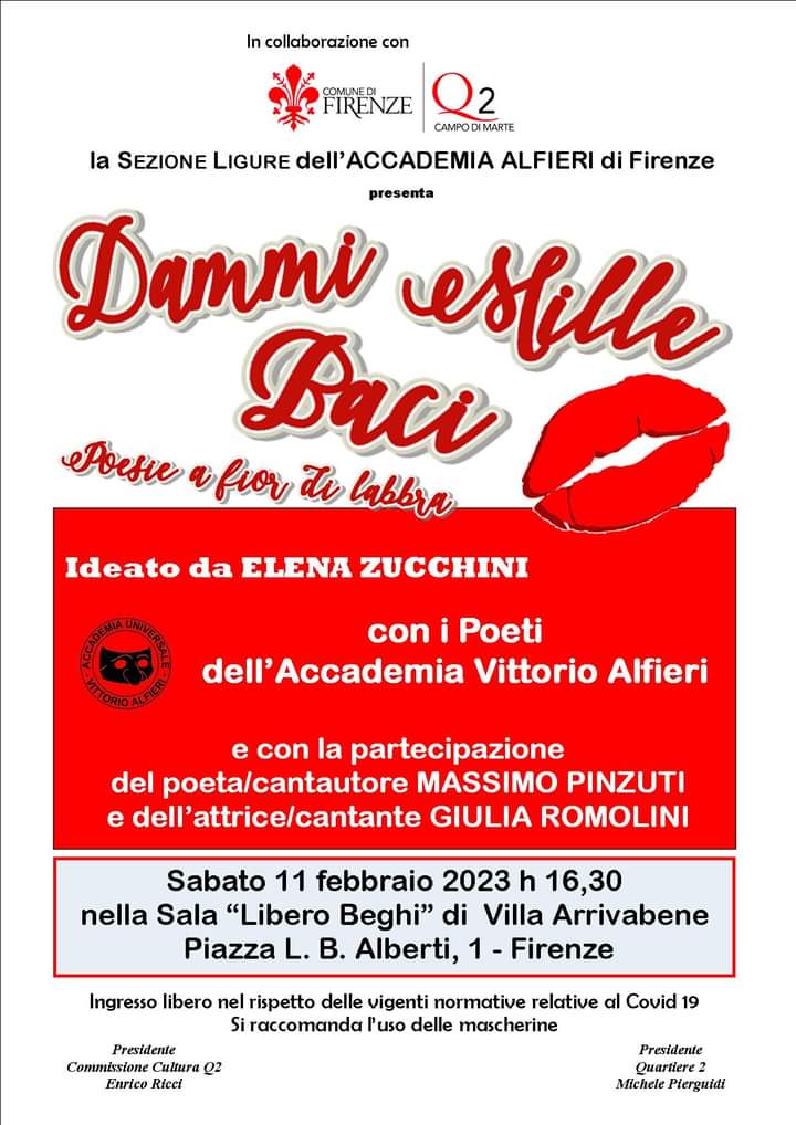 Sabato 11 Febbraio alle ore 16.00, nella Sala Libero Beghi in Villa Arrivabene, si terrà l'evento "Dammi mille baci - Poesie a fior di labbra" a cura di Elena Zucchini, coordinatrice della Sezione Ligure dell'Accademia Alfieri di Firenze, con la partecipazione dei poeti dell'Accademia e gli intermezzi musicali degli artisti Massimo Pinzuti e Giulia Romolini.