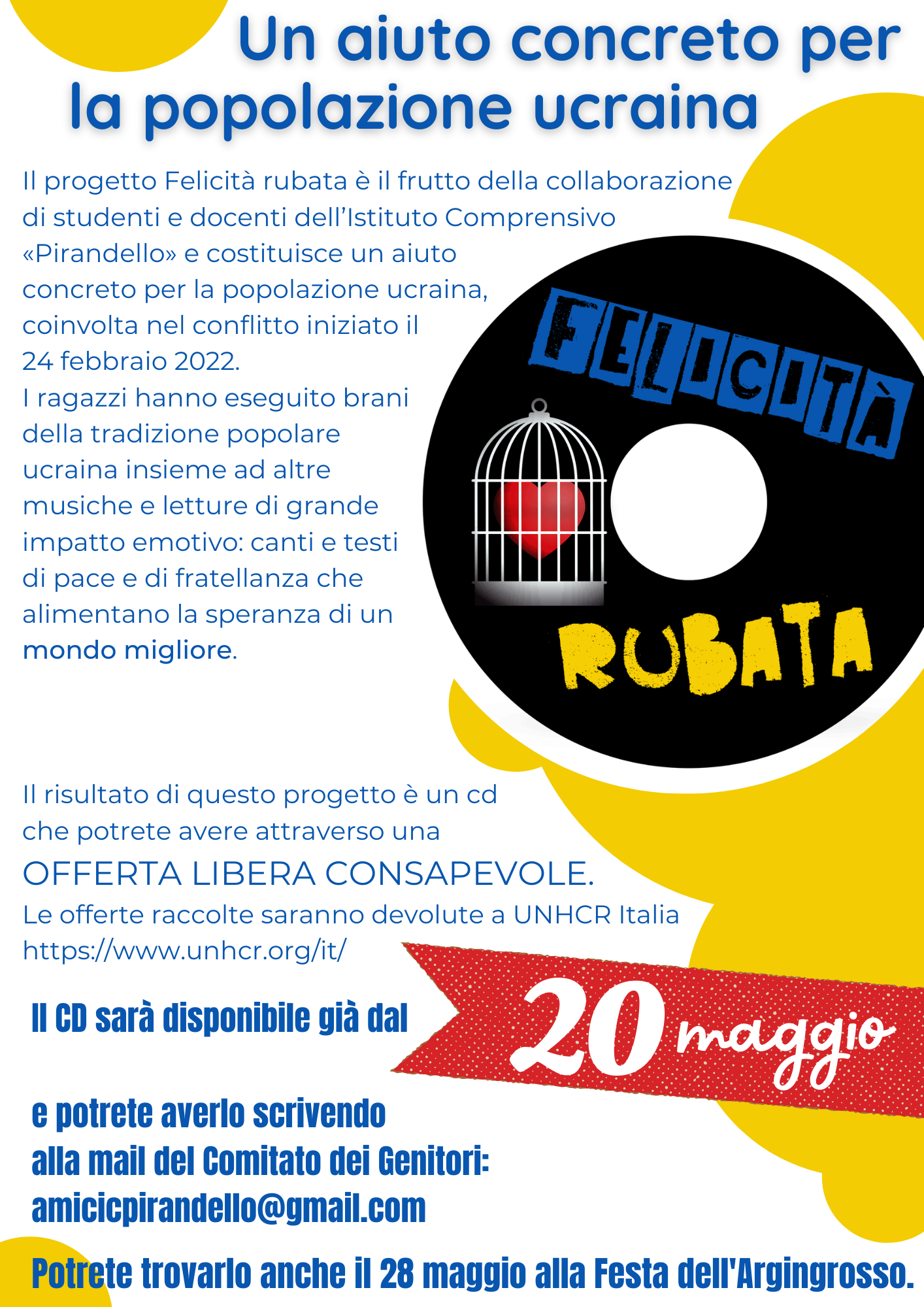 L'Istituto Comprensivo Pirandello ha realizzato Felicità rubata, un cd di musiche e letture i cui proventi di vendita saranno interamente devoluti all’Unhcr (www.unhcr.org/it), Agenzia Onu per i rifugiati, in favore della popolazione dell’Ucraina colpita dalla guerra.