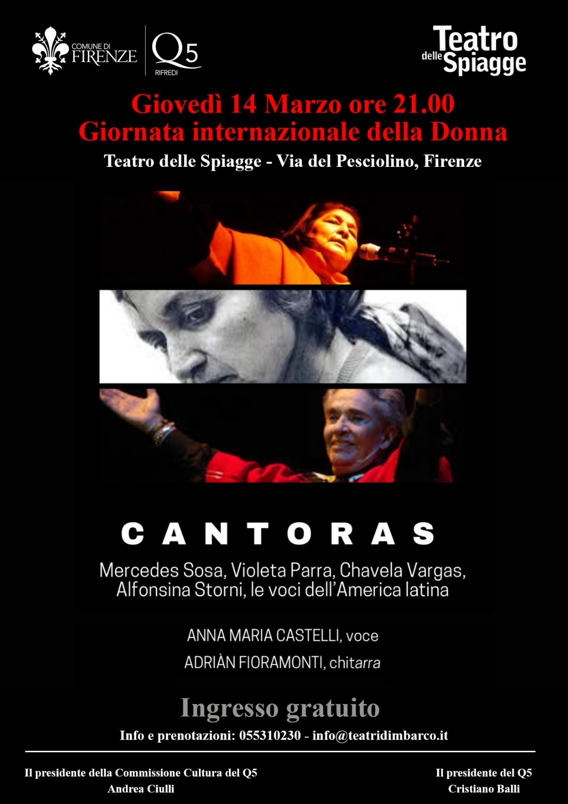 Lo spettacolo "Amori difficili" sarà sostituito dalla serata musicale "Cantoras" dove la voce di Anna Maria Castelli e la chitarra di Adrian Fioramonti interpreteranno brani di Mercedes Sosa, Violeta Parra, Chavela Vargas, Alfonsina Storni.