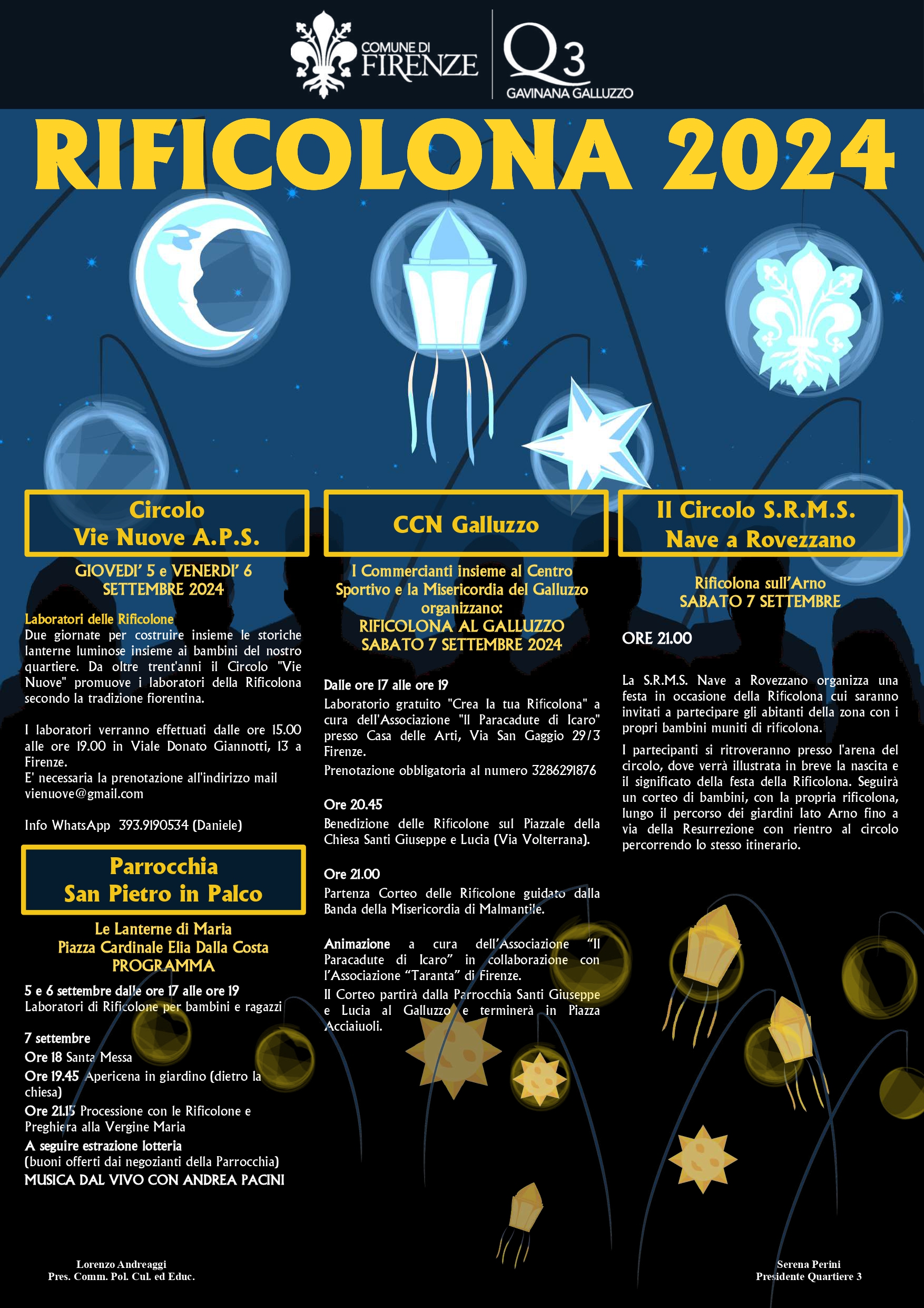 Si parte giovedì 5 e venerdì 6 settembre con i laboratori delle Rificolone presso il Circolo delle Vie Nuove in viale Donato Giannotti n. 13: in queste due giornate si svolgeranno dei laboratori per costruire insieme le storiche lanterne luminose. I laboratori (ad offerta libera) si svolgeranno dalle ore 15:00 alle ore 19:00. Per partecipare è gradita la prenotazione scrivendo all’indirizzo e-mail vienuove@vienuove.it.