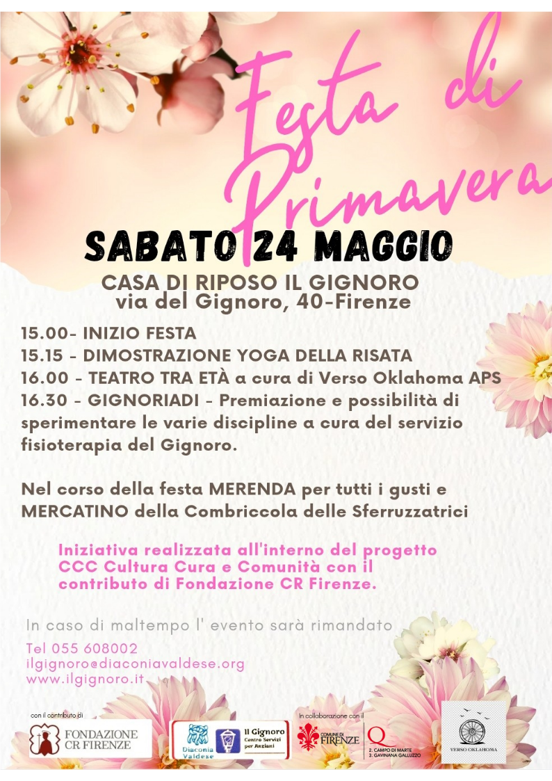 Sabato 24 maggio 2025 presso la RSA Il Gignoro (via del Gignoro, 40 - Firenze) si terrà la Festa di Primavera, con la collaborazione del Quartiere 2 e del Quartiere 3.