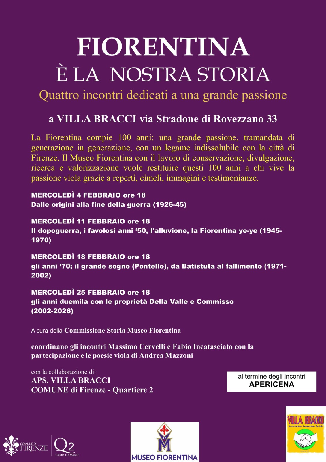Nuovo ciclo di incontri dedicati alla Fiorentina, nell'anno del centenario della fondazione del club, a cura della Commissione Storia Museo Fiorentina con la collaborazione dell'APS Villa Bracci e del Quartiere 2; ogni mercoledì di Febbraio alle ore 18.00, presso il Centro Età Libera di Villa Bracci in via Stradone di Rovezzano 33, un capitolo diverso della storia del club: