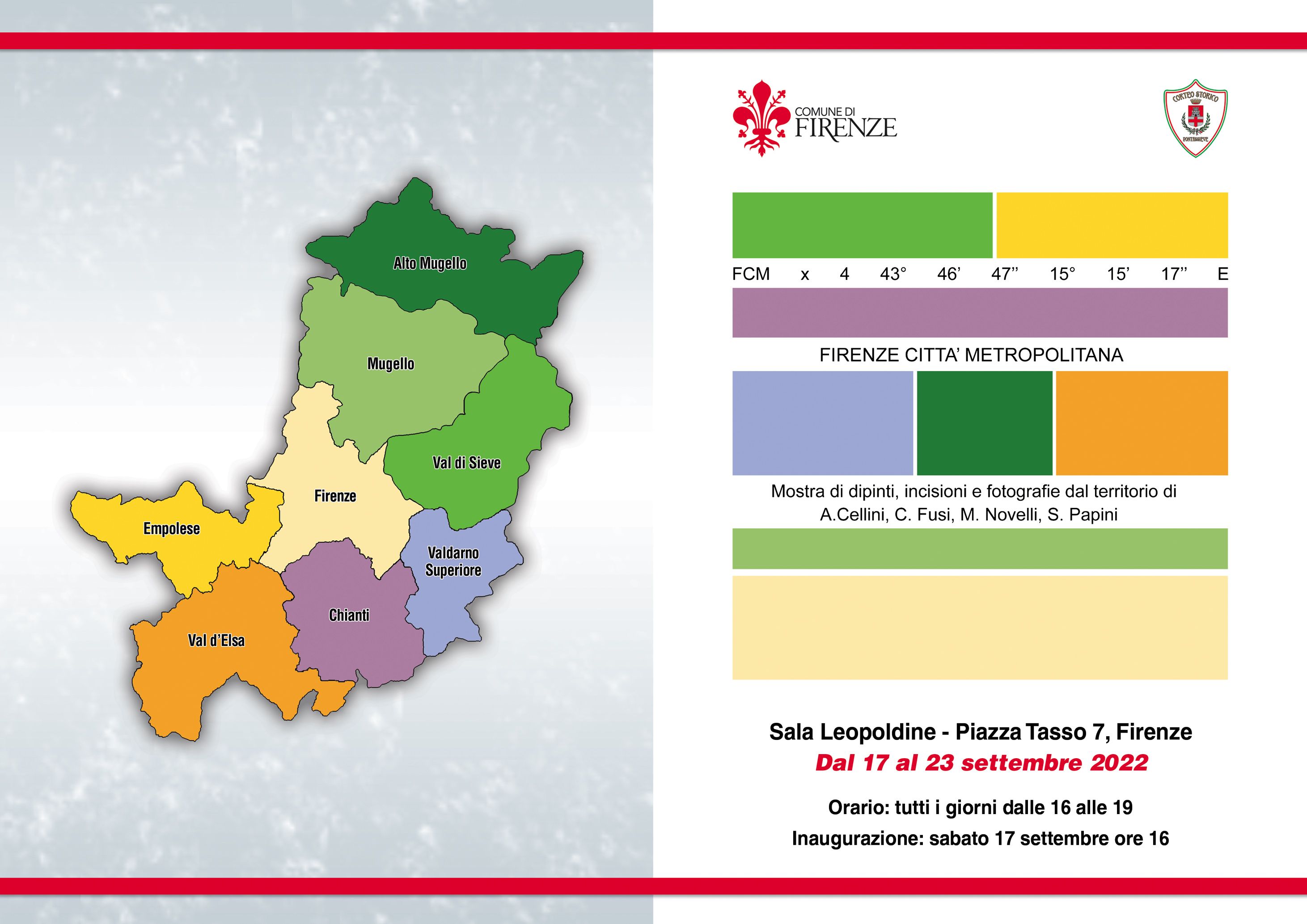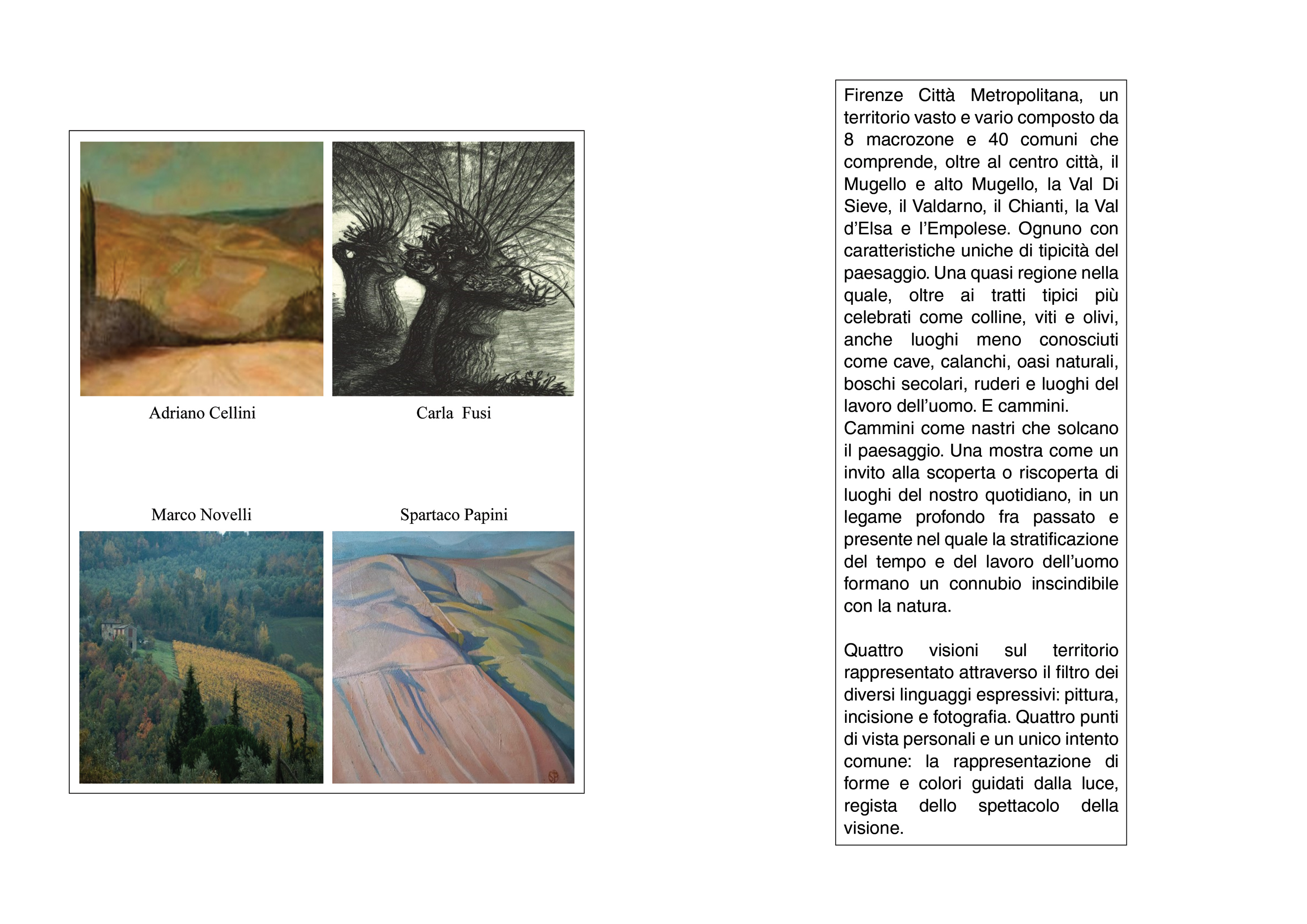 Firenze città metropolitana, un territorio vasto e vario composto da 8 macrozone e 40 comuni, ognuno con caratteristiche uniche di tipicità di paesaggio. Quattro artisti, Adriano Cellini, Carla Fusi, Marco Novelli, Spartaco Papini, per altrettante quattro visioni sul territorio rappresentato attraverso il filtro dei diversi linguaggi espressivi: pittura, incisione, fotografia. La mostra, ad ingresso libero, si terrà presso la Sala Ex Leopoldine dal 17 al 23 settembre, con orario 16-19. Inaugurazione sabato 17 settembre ore 16.
