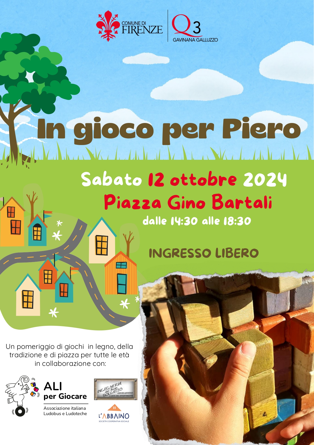 Sabato 12 ottobre 2024 in Piazza Gino Bartali dalle ore 14:30 alle 18:30 si svolgerà un pomeriggio di giochi in legno, della tradizione e di piazza per tutte le età. L'evento è ad ingresso libero.