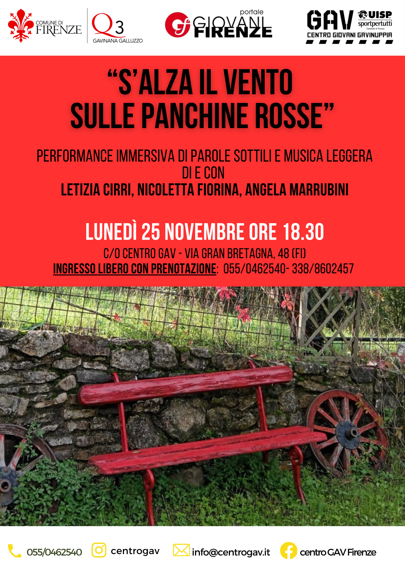 Il Quartiere 3 collabora con UISP Firenze per la performance “S’alza il vento sulle panchine rosse”, spettacolo immersivo di musica e parole di Letizia Cirri, Nicoletta Fiorina e Angela Marrubbini che si svolgerà presso il Centro Gav di via Gran Bretagna 48.