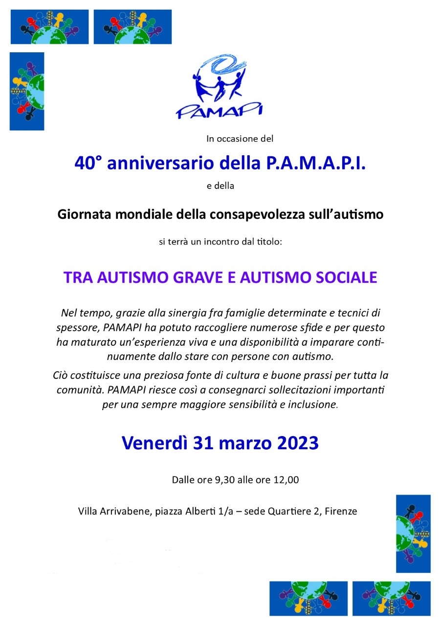Venerdì 31 Marzo 2023 dalle ore 9.30 alle ore 12.00, nella sala Libero Beghi in Villa Arrivabene, si terrà l'incontro dal titolo "Tra autismo grave e autismo sociale", organizzato dal centro P.A.M.A.P.I. in occasione della Giornata mondiale della consapevolezza sull'autismo nel giorno del 40° anniversario dalla fondazione del centro; un incontro mirato alla sollecitazione di una sempre maggiore sensibilità ed inclusione, basato sulla condivisione di tecniche e prassi frutto di un'esperienza decennale nel rapporto diretto con la comunità.